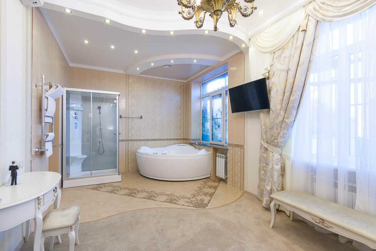 Роскошный двухкомнатный номер отеля Белладжио в Ростове-на-Дону, состоящий из гостиной, спальни и ванной комнаты с джакузи.