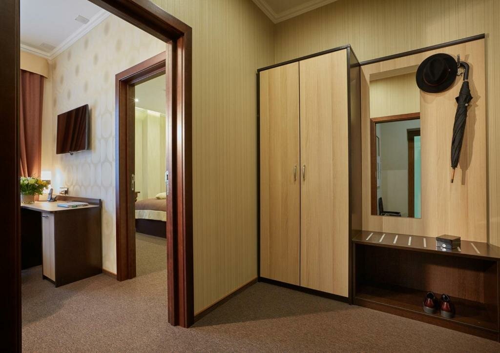 Двухместный номер с двухспальной кроватью. В номере чайник, холодильник, душ, санузел, туалетные принадлежности, полотенца, халаты, тапочки. В стоимость входит завтрак.
