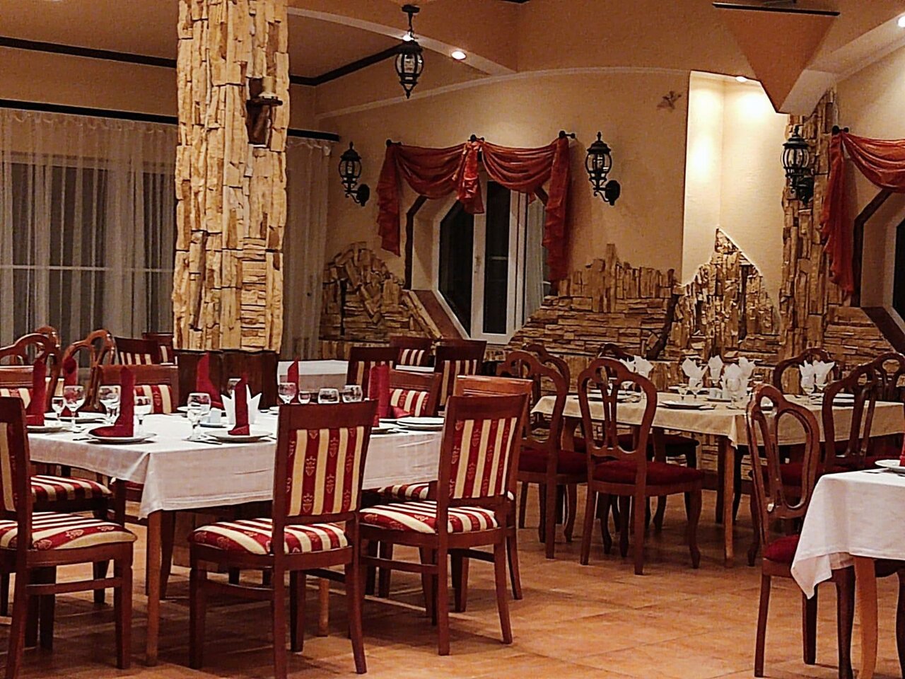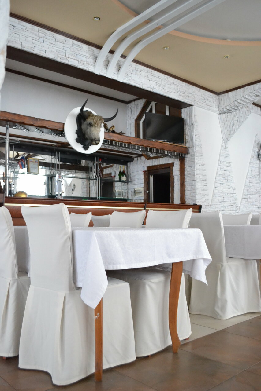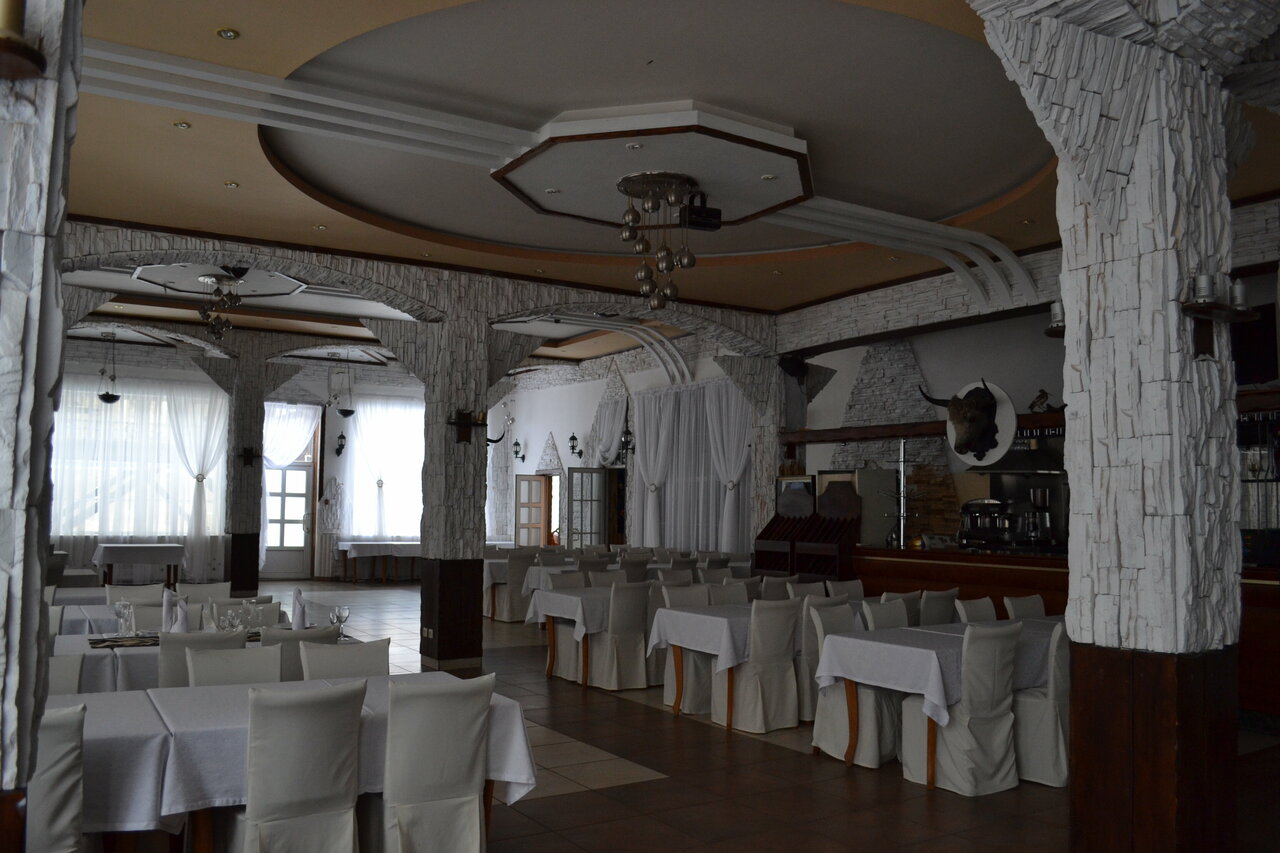 Оценить сервис или кухню не удалось — зал был н а спецобслуживании. Первое впечатление — это пафосный советский колхоз! ))))
