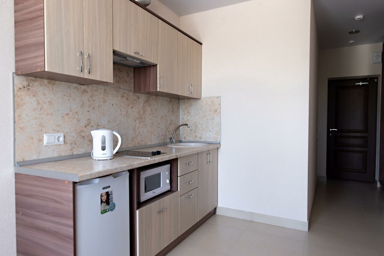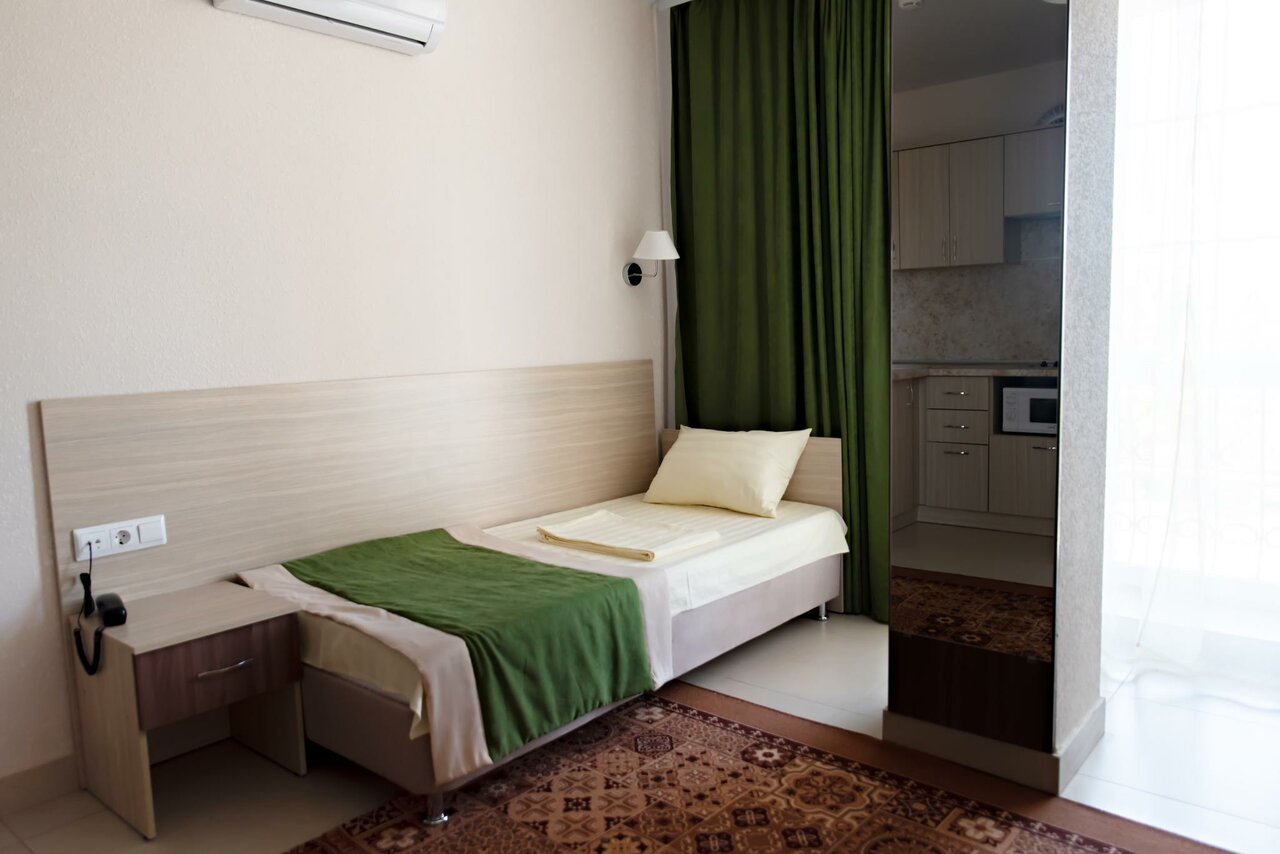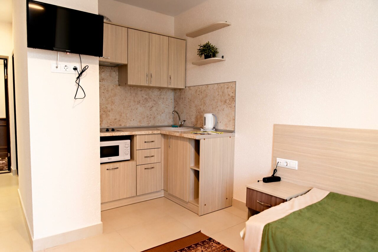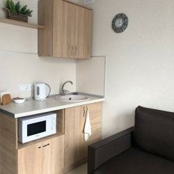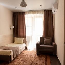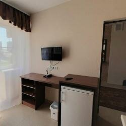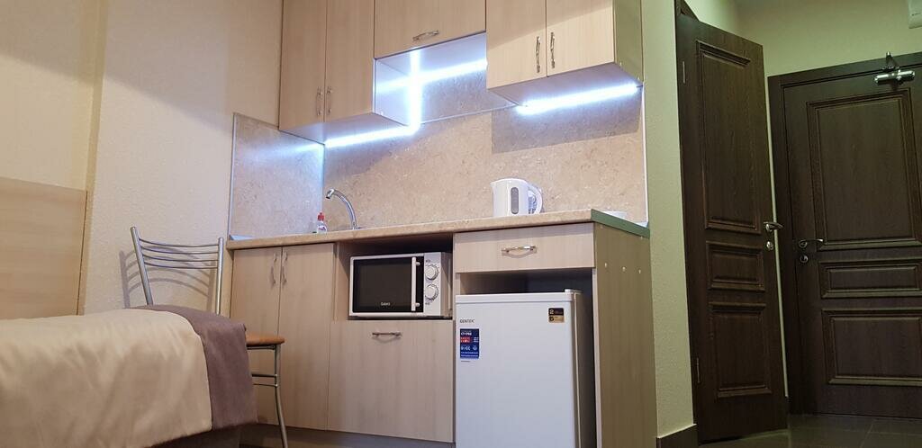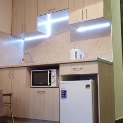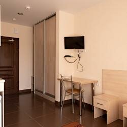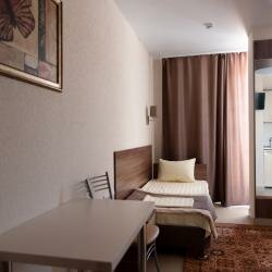 Улучшенный одноместный номер полностью оснащен всем необходимым: полотенца, тапочки, косметические принадлежности,кухонный гарнитур, чайник, микроволновая печь, столовые приборы и посуда. В каждом номере собственный душ и санузел.
