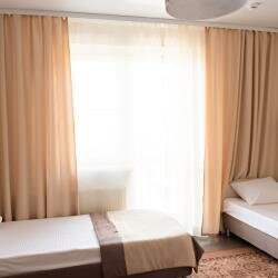 Трехместный номер с двухспальной кроватью и крело-кроватью/диван-кроватью/односпальной кроватью. Полностью оснащен всем необходимым: полотенца, тапочки, косметические принадлежности,кухонный гарнитур, чайник, микроволновая печь, столовые приборы и по