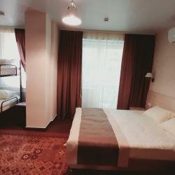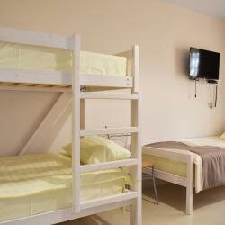 Четырехместный номер с двухспальной кроватью и двухъярусной кроватью или с четырьмя односпальными кроватями . Полностью оснащен всем необходимым: полотенца, тапочки, косметические принадлежности,кухонный гарнитур, чайник, микроволновая печь, столовые