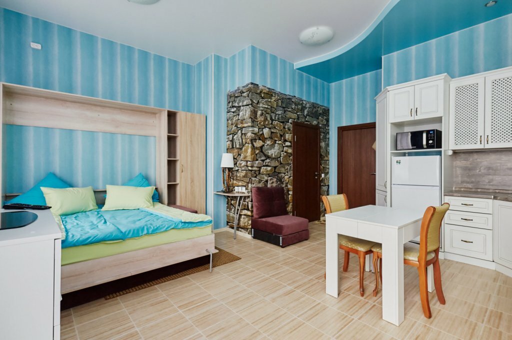- Полностью оборудованные номера (бытовая техника, качественное бельё, косметические принадлежности).