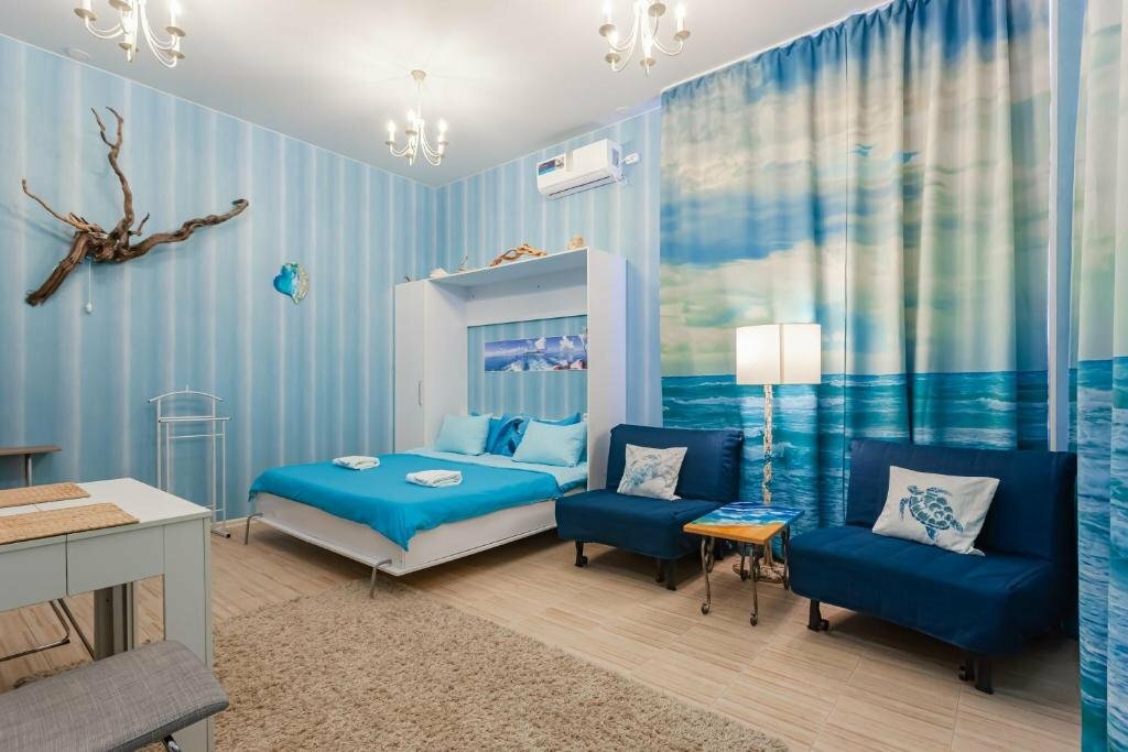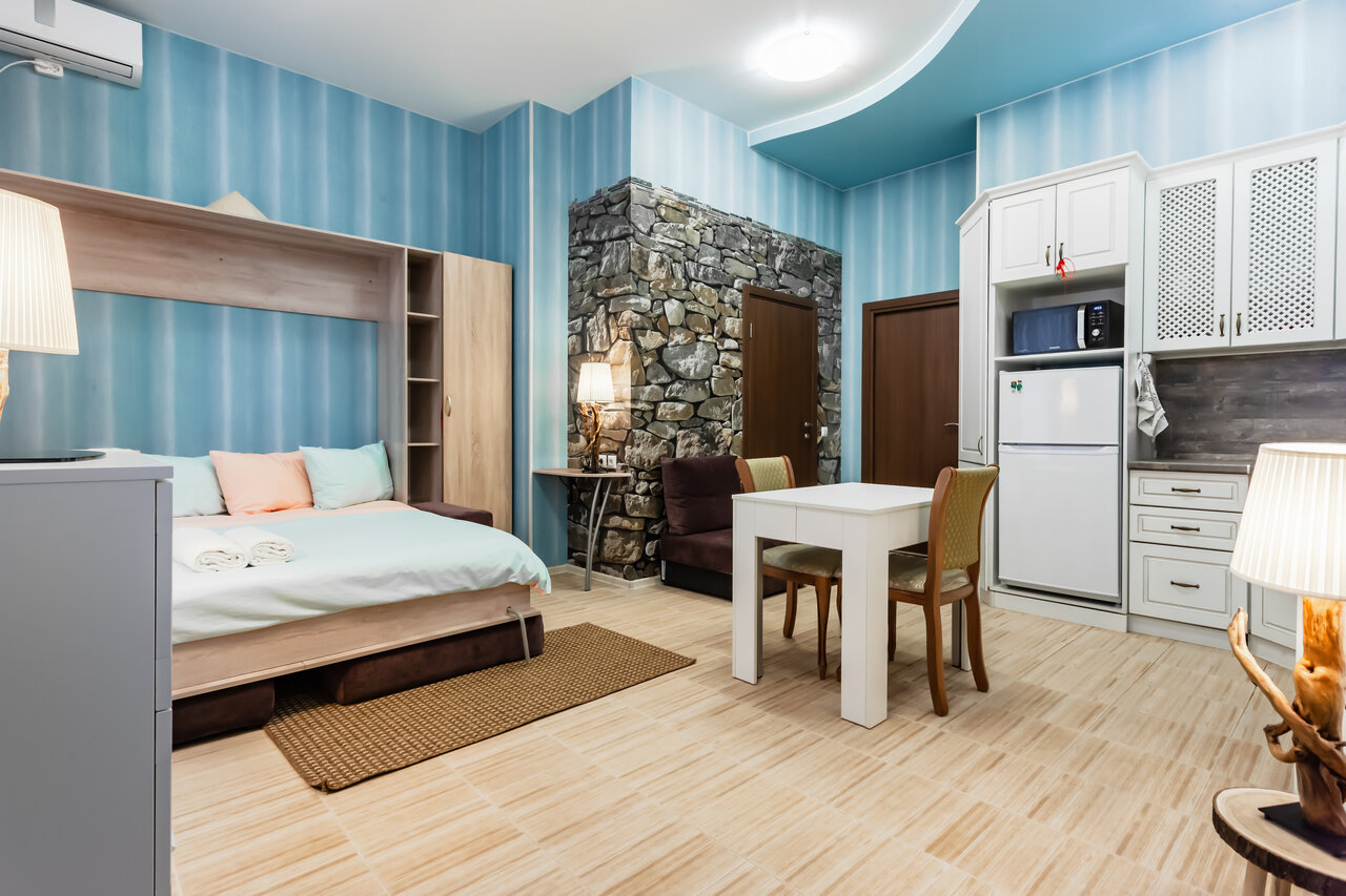 проживали в арабском номере ). студия самая большая из всех и самая дешевая на тот момент. все очень продумано и сделано для комфорта. матрас на кровати супер, вот диван не очень, проваливается уже неравновмерно. есть вай фай, телевизор с множеством каналов от ростелекома. душевая кабина с небольшой ванной и джакузи. есть даже маленькая стиральная машина. звукоизоляция хорошая. из минусов может только расположение кондиционера напротив кровати, ночью дует в лицо, но это не критично совсем