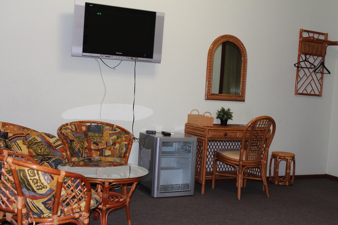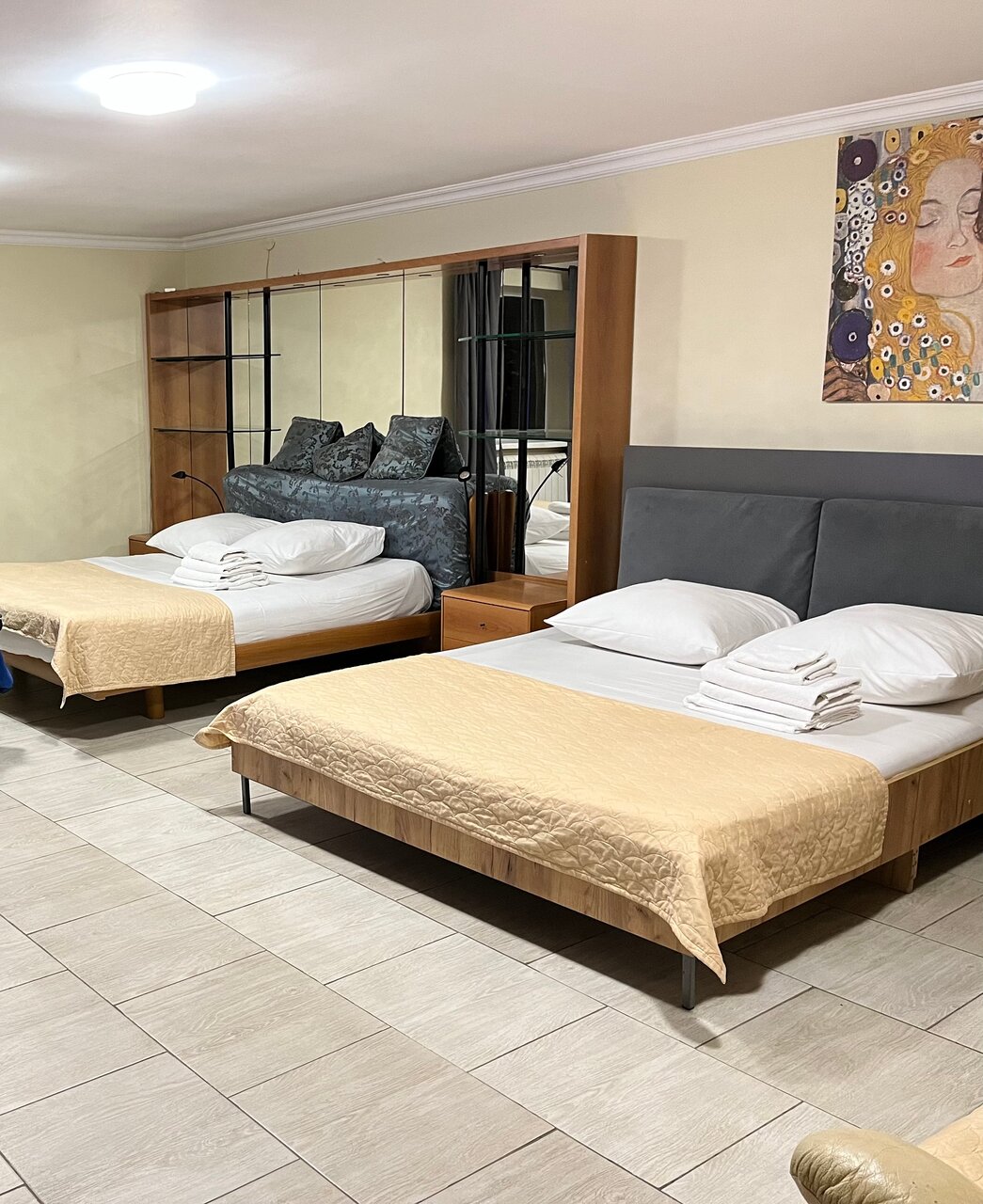 Отлично подойдет для компании из 3-х человек либо семьи. В номере есть мягкие, удобные кровати и места для вещей: журнальный столик, шкаф, пуфик. Имеется зеркало, прикроватные тумбы и холодильник. Всегда есть беспроводной интернет и горячая вода.