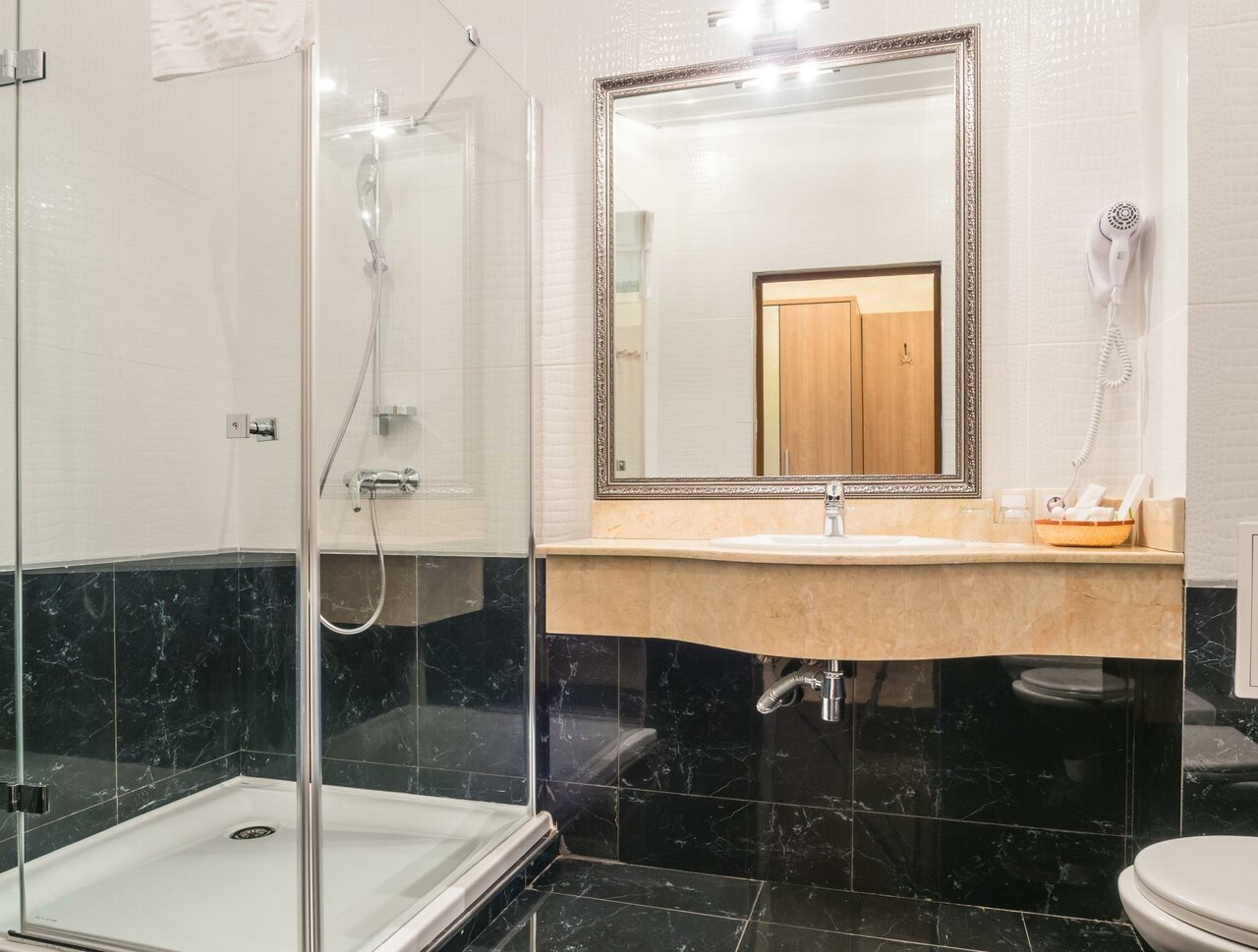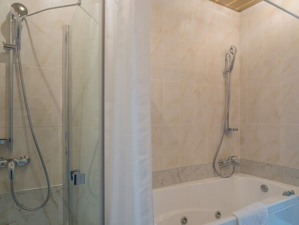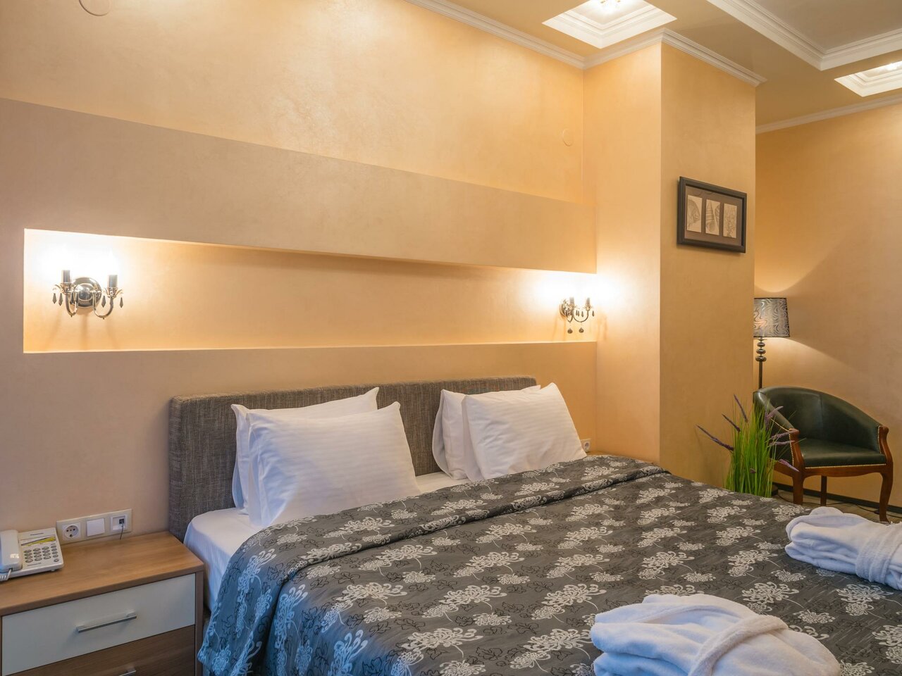Комфортный однокомнатный номер с двуспальной кроватью с прикроватными тумбочками, прихожей и просторной ванной комнатой.