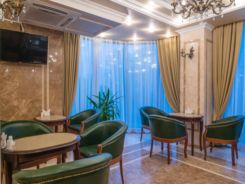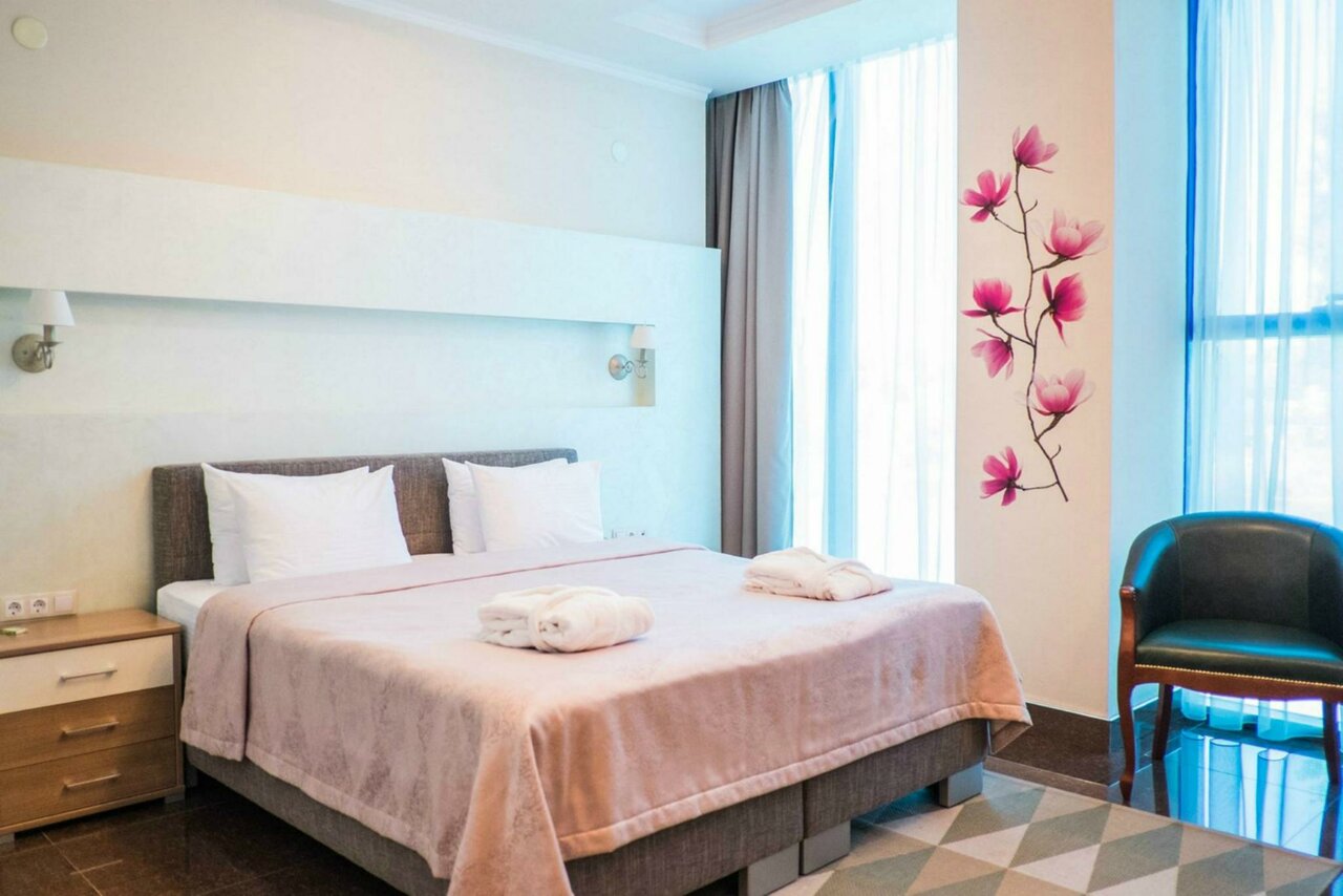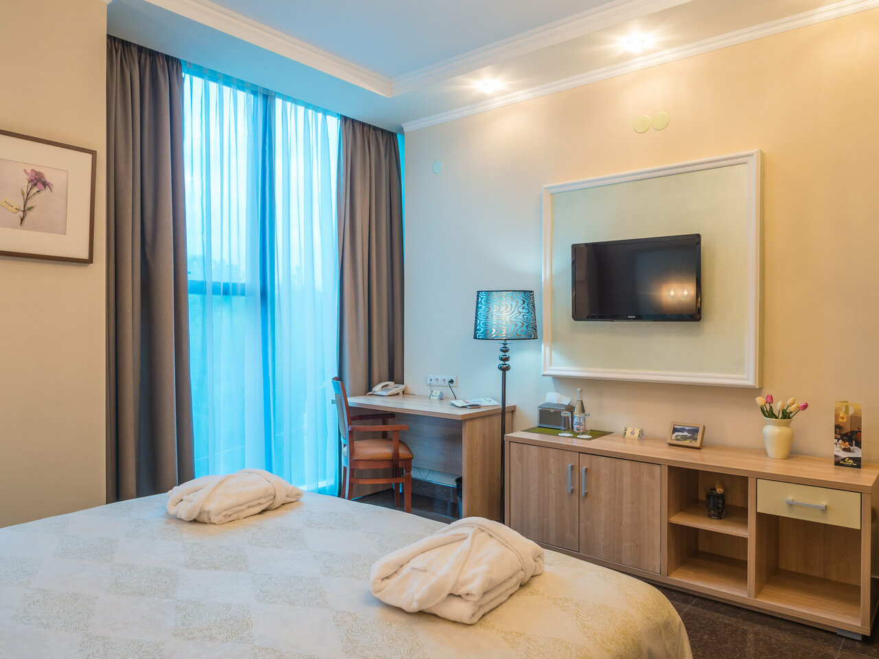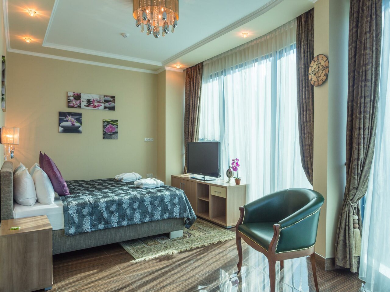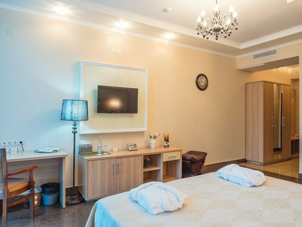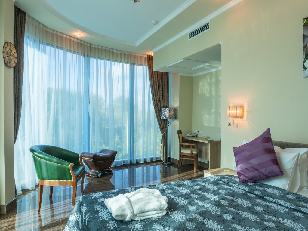 Удобства: — Номера (от 4 000 до 12 000 ₽/ночь) с кондиционером, Wi-Fi, телевизором, мини-баром и санузлом. — Питание: 2 ресторана, 3 бара, летняя веранда, варианты завтраков и полного пансиона. — Досуг: тренажёрный зал, сауна, хаммам, бильярд, детская площадка. — Услуги: бесплатная парковка, платный трансфер, конференц-залы, прачечная, круглосуточная стойка регистрации.
