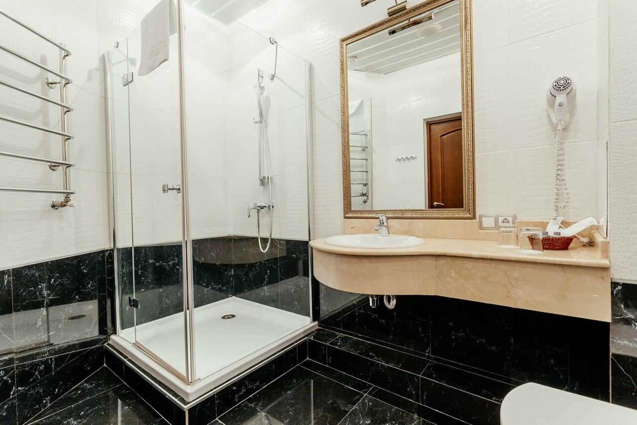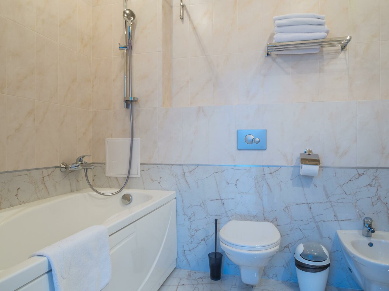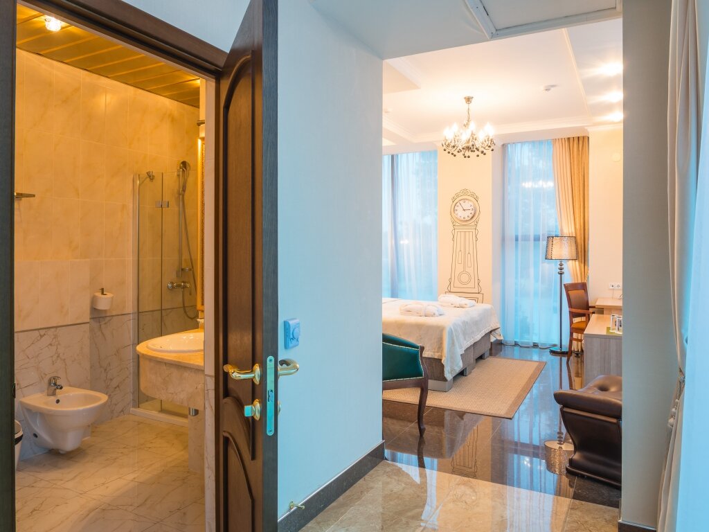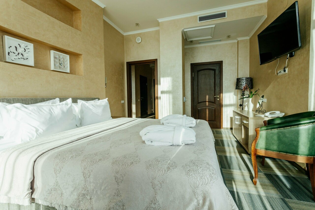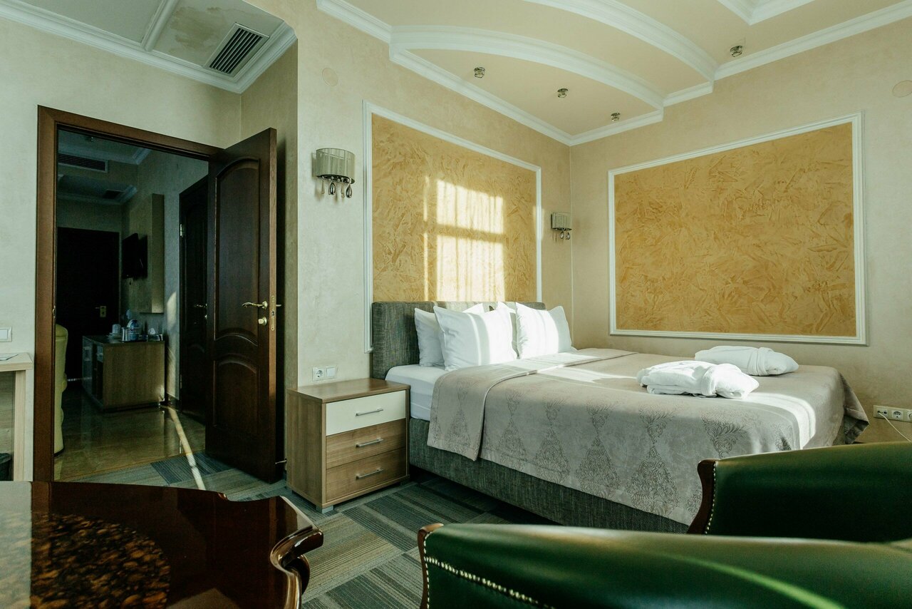 Комфортный однокомнатный номер с зоной отдыха, большой кроватью, прихожей и просторной ванной комнатой.