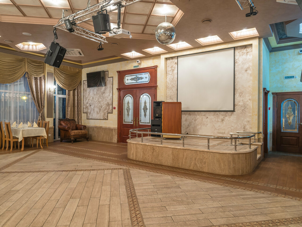 Уютный и светлый зал с витражным остеклением. Подойдет для мероприятий разного формата: семинаров, конференций, круглых столов, тренингов и т.д.