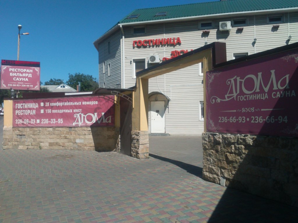 Гостиница «Дюма» (Ростов-на-Дону, ул. Мадояна, 110/2) — недорогой отельный комплекс с одной звездой, работающий круглосуточно. Предлагает номера с кондиционером, Wi-Fi, телевизором, мини-баром и санузлом (от 1500 ₽/ночь). В инфраструктуре: открытый сезонный бассейн, сауна, джакузи, ресторан, бар у бассейна, бизнес-центр и бесплатная парковка. Доступны платные услуги: трансфер, проживание с животными, прачечная. Заезд — с 14:00, выезд — до 12:00. После реконструкции 2019 года гостиница обновила интерьеры и оснащение. Подробнее: hoteldyma.ru. Контакты: +7 (863) 236-66-93, +7 (923) 888-04-21.