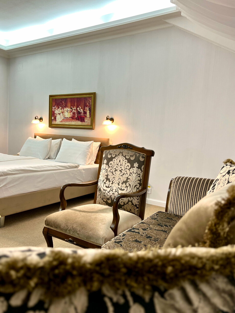 Двухкомнатный люкс с двумя уютными спальнями. Номер оснащен двуспальной кроватью 180*200. комфортная рабочая зона и уютная зона отдыха, которая состоит из дивана и кресел.