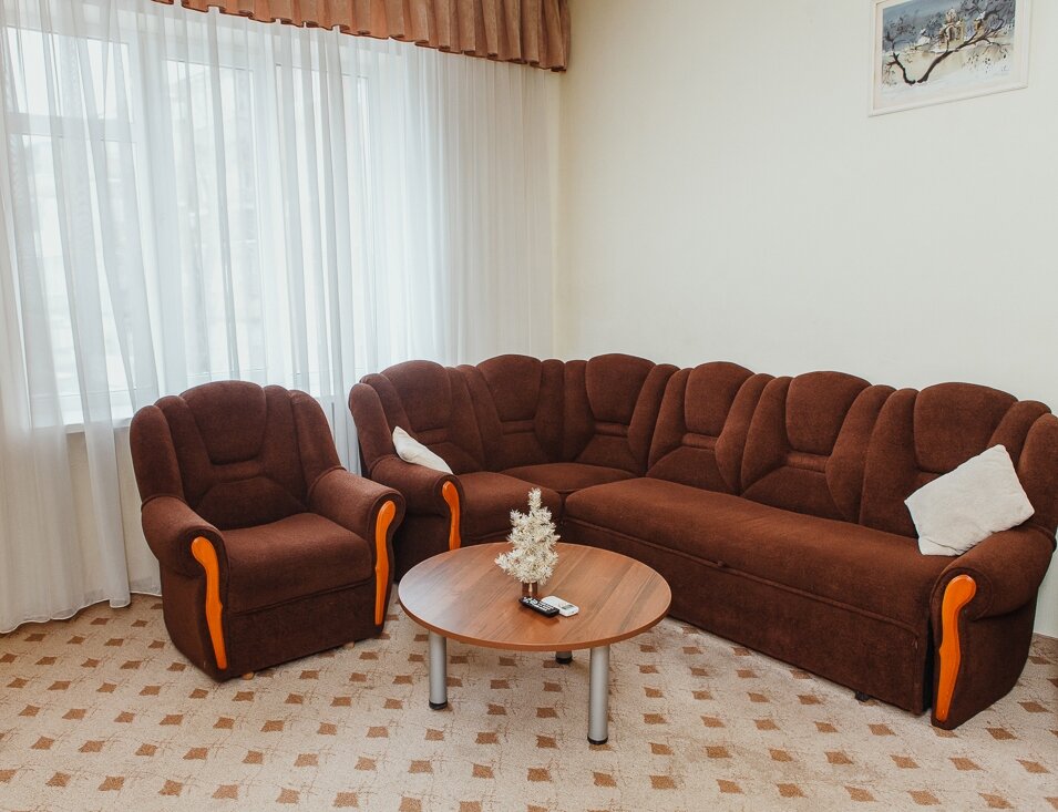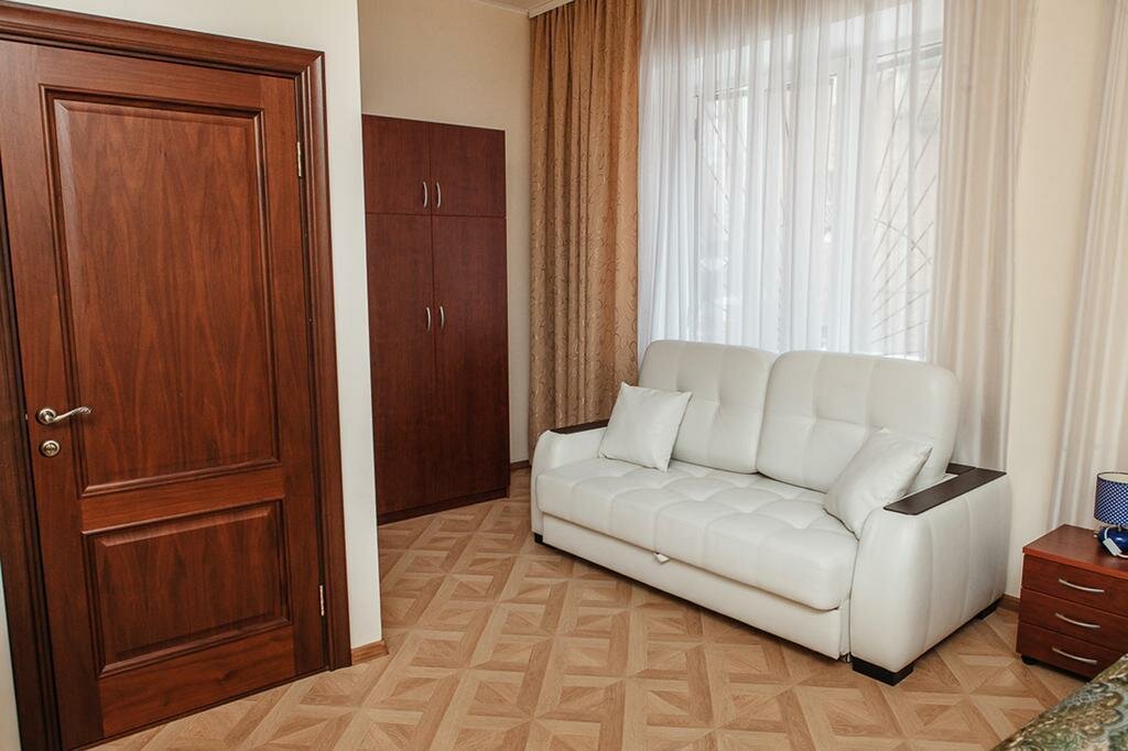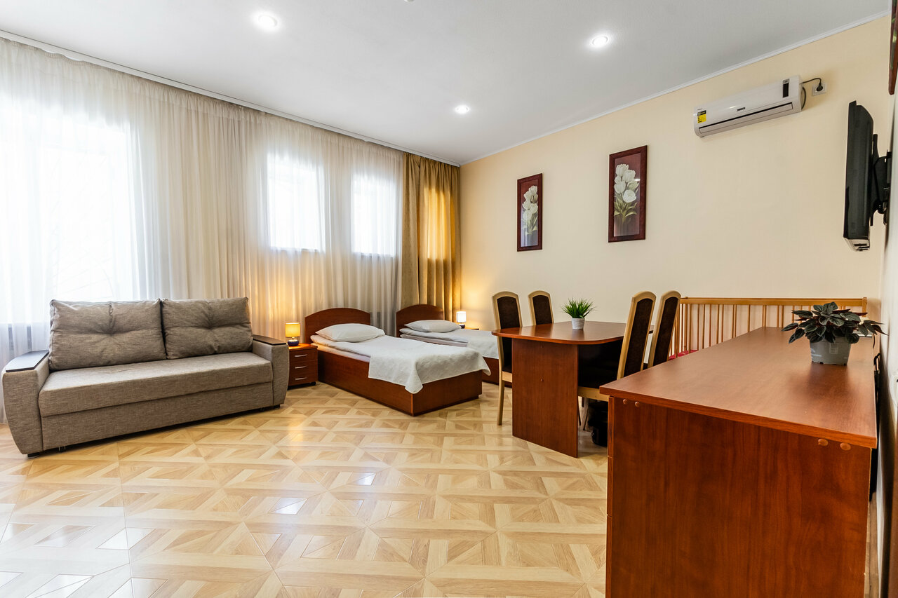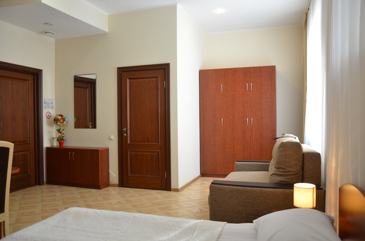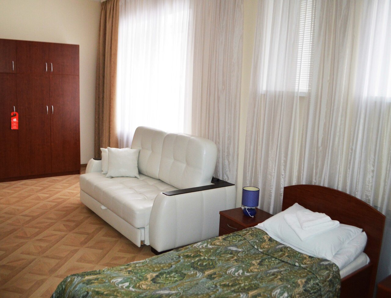 Просторный светлый номер. Отличный вариант для размещения 3 человек.В номере 2 односпальные/ 1 двуспальная кровати и кресло-кровать.