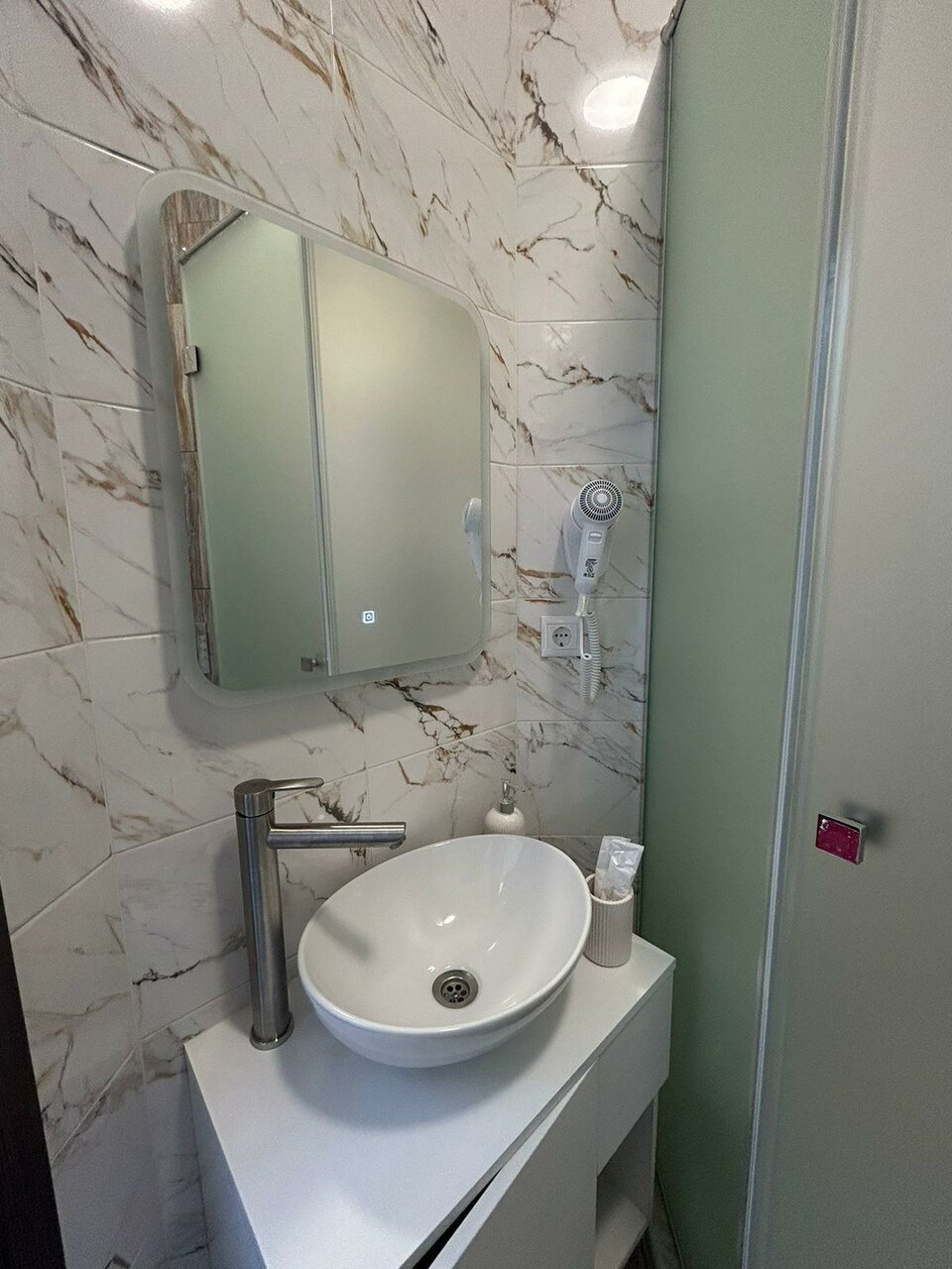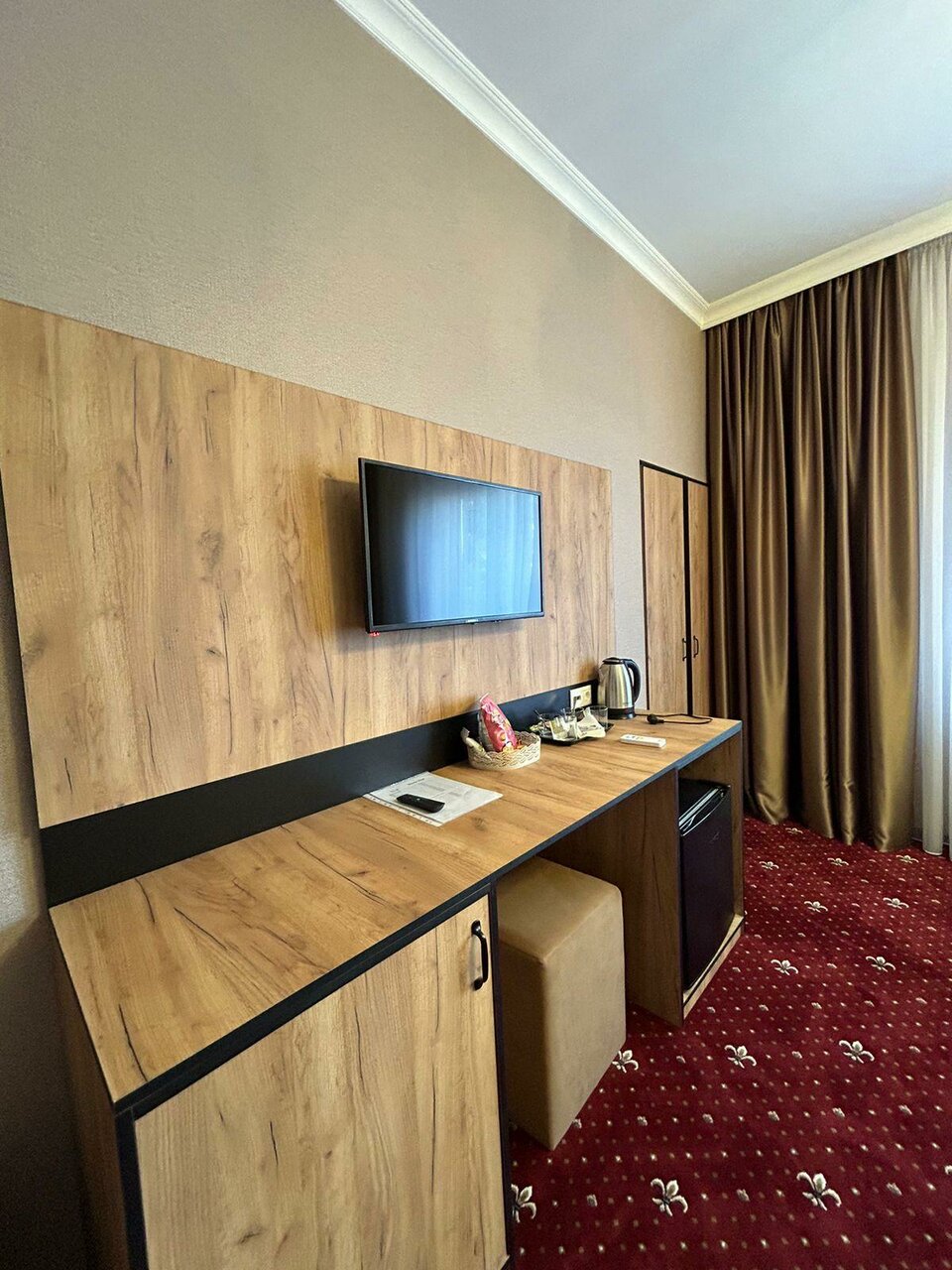 Место очень приятно. Хорошие номера со всей мебелью. Есть даже столик с возможностью поработать за ноутбуком. Парковка под окнами, Шума машин от дороги почти не слышно, спать не мешает. ТВсмарт, Кондиционер над дверью, высоко, не мешает. Персонал отличный. Немного не удобно с раковиной, она поджата душевой кабиной, но как бы не так долго у раковины и стоишь. Есть холодильник, чайник. Удобно что до магазинов рукой падать.