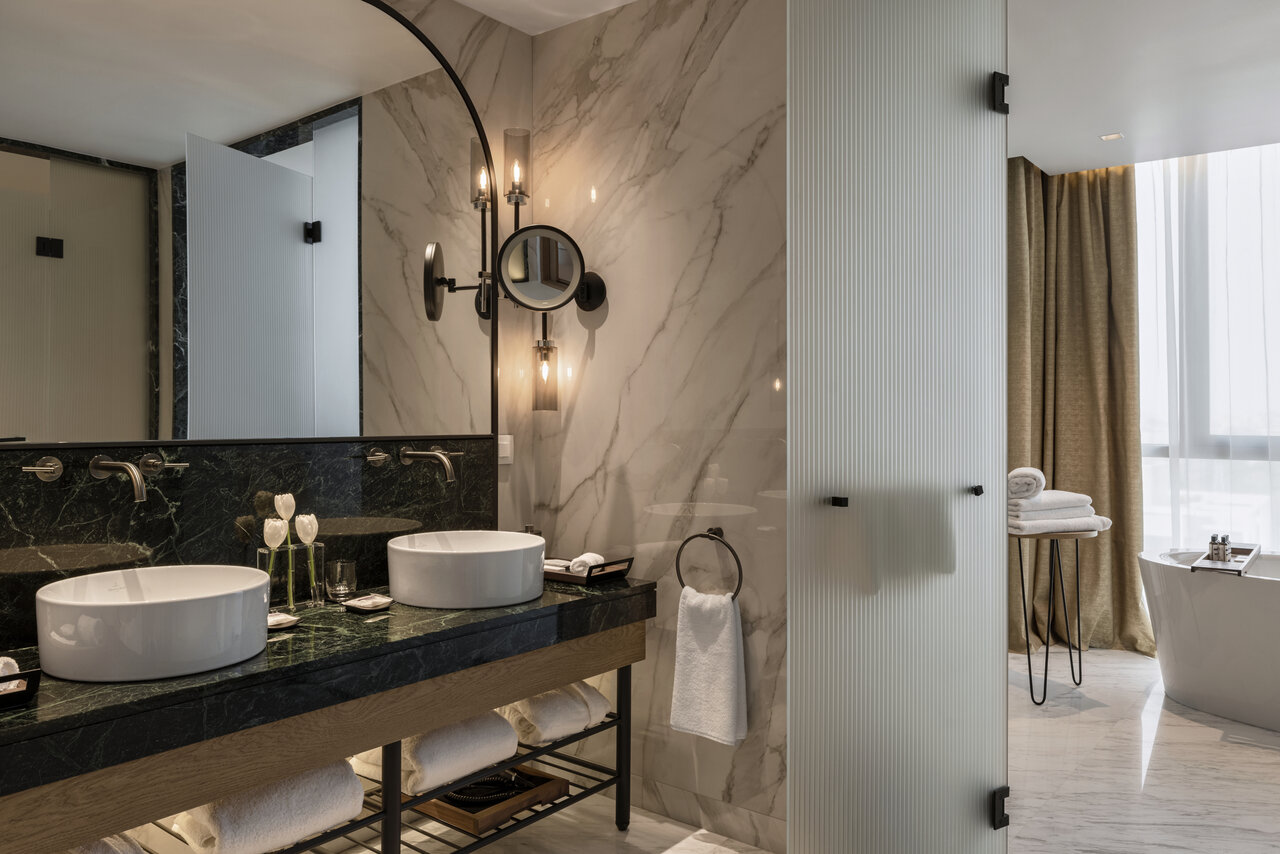 Шикарный отель, номера на высоком уровне, в номере есть все, что нужно — гель для душа, кондиционер, шампунь, мыло, зубные принадлежности, хороший фен, халаты и тапочки. Персонал всегда поможет и подскажет, что по телефону, что лично в отеле. Понимание, что ты в отеле высокого класса, приходит, когда ты только к нему подъезжаешь. Везде чисто, все блестит и сверкает. Есть своя подземная парковка, но для высоких внедорожников нужно быть внимательнее — высота парковки в некоторых местах 2 метра. Берите с собой талончик от парковки, его отмечают на ресепшен — для гостей парковка бесплатная. Хотелось бы видеть 2 кулера на этаже, а то пока искала кулер на 10 этаже, пришлось обойти весь этаж. В номере есть чайник, стаканы, чай в пакетиках, 2 бутылки воды и что-то в мини баре еще было — шоколадки, вроде, и бутылочка вина. Были проездом, поэтому все прелести отеля оценить не смогу — поздно заехали и рано выехали.