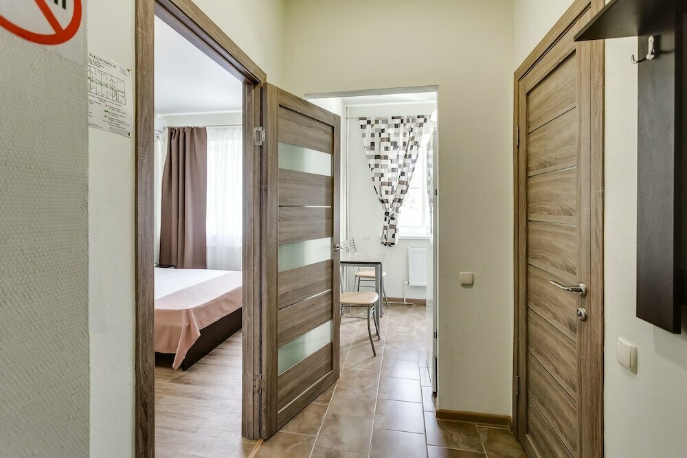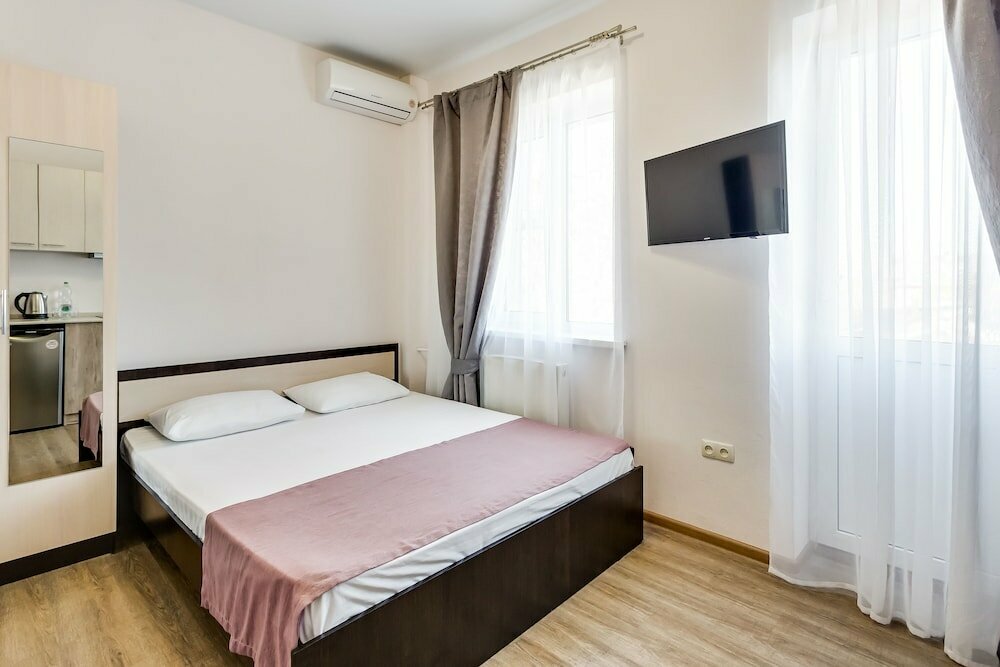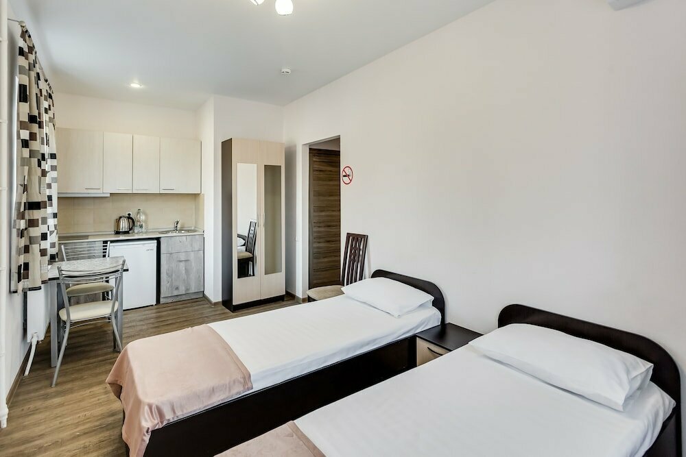Отель в принципе не плохой, встретили приветливо. Но снимаю звезду лишь потому что заехали мы туда 9 августа, на улице была 40 градусов жара и было одно желание душ и отдыхать. Но к нашему удивлению там находится было невыносимо. Полотенцесушитель был не дотронуться и пол с подогревом и это в такую жару. Муж спустился на ресепшн чтобы решить эту проблему, на что администратор пожав плечами сказала что так и должно быть. Душевая кабинка была неисправна, унитаз закреплён к стене очень высоко, но может это и плюс, чтоб избежать ожога от пола))), не было одноразовых зубных щёток и пасты. Полы не очень чистые и кровать очень жёсткая, может кому то это и нравится, но не всем. Понравилось лишь то что есть кухня, посуда, эл. чайник. Магазины расположены далеко от отеля. Промучались ночь. Больше в этом отеле не остановимся, к сожалению. Не рекомендую.