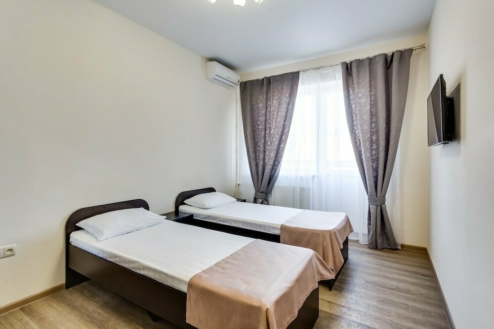 Две односпальные кровати, телевизор, кондиционер, сейф, телефон для внутренней связи, Wi-Fi, вода, чайный набор, мини-холодильник, ванная комната с душем, фен, косметические принадлежности, тапочки, полотенца,гладильные принадлежности.
