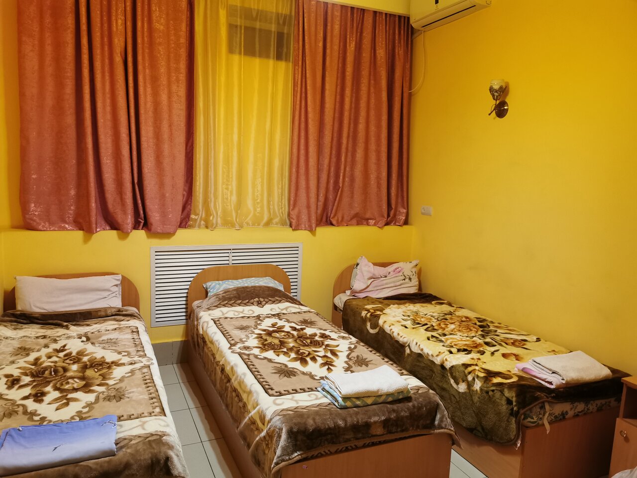 три односпальные кровати, постельные принадлежности, плоский телевизор, бесплатный wi-fi, парковка на территории бесплатная, бесплатные туалетные принадлежности, тапочки, звукоизоляция, услуга «звонок-будильник», полотенца, сплит-система