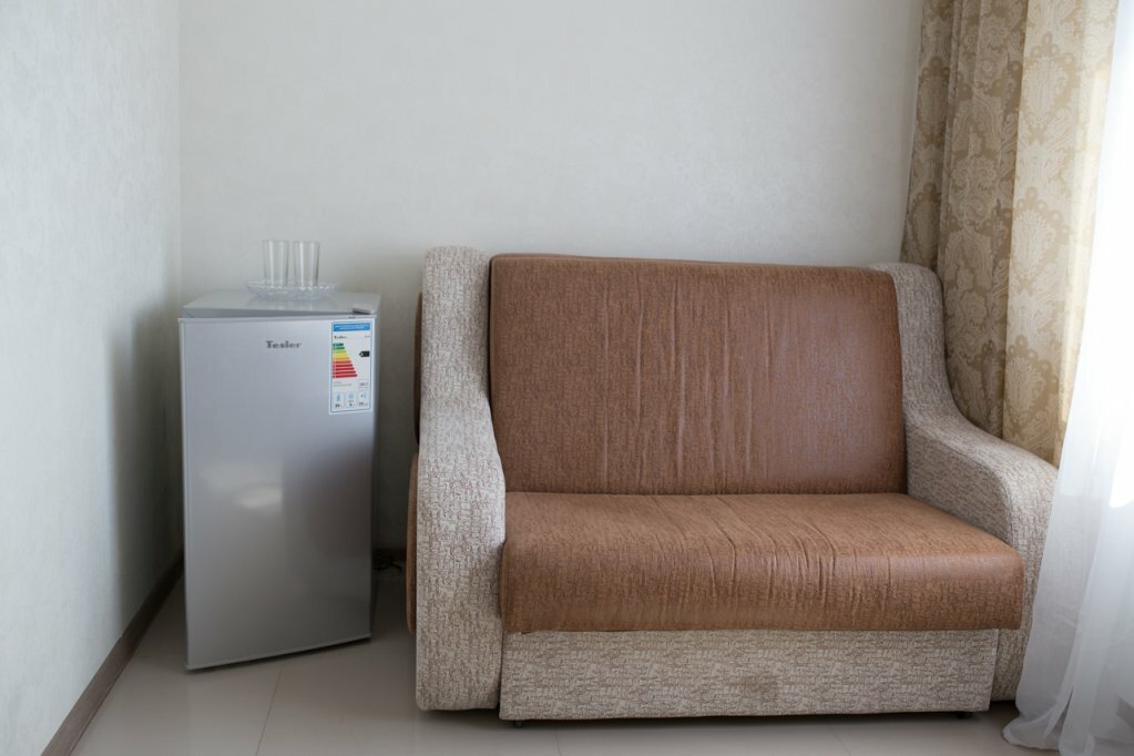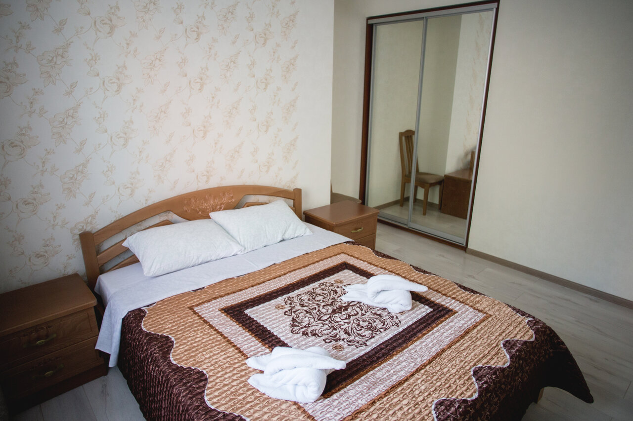 Просторный и комфортный номер площадью 40кв.м с собственной ванной комнатой. Интерьер выполнен в современном стиле и спокойных тонах. Номер оборудован кроватью размера King size (180см) с удобным ортопедическим матрасом, креслами с журнальным столом.