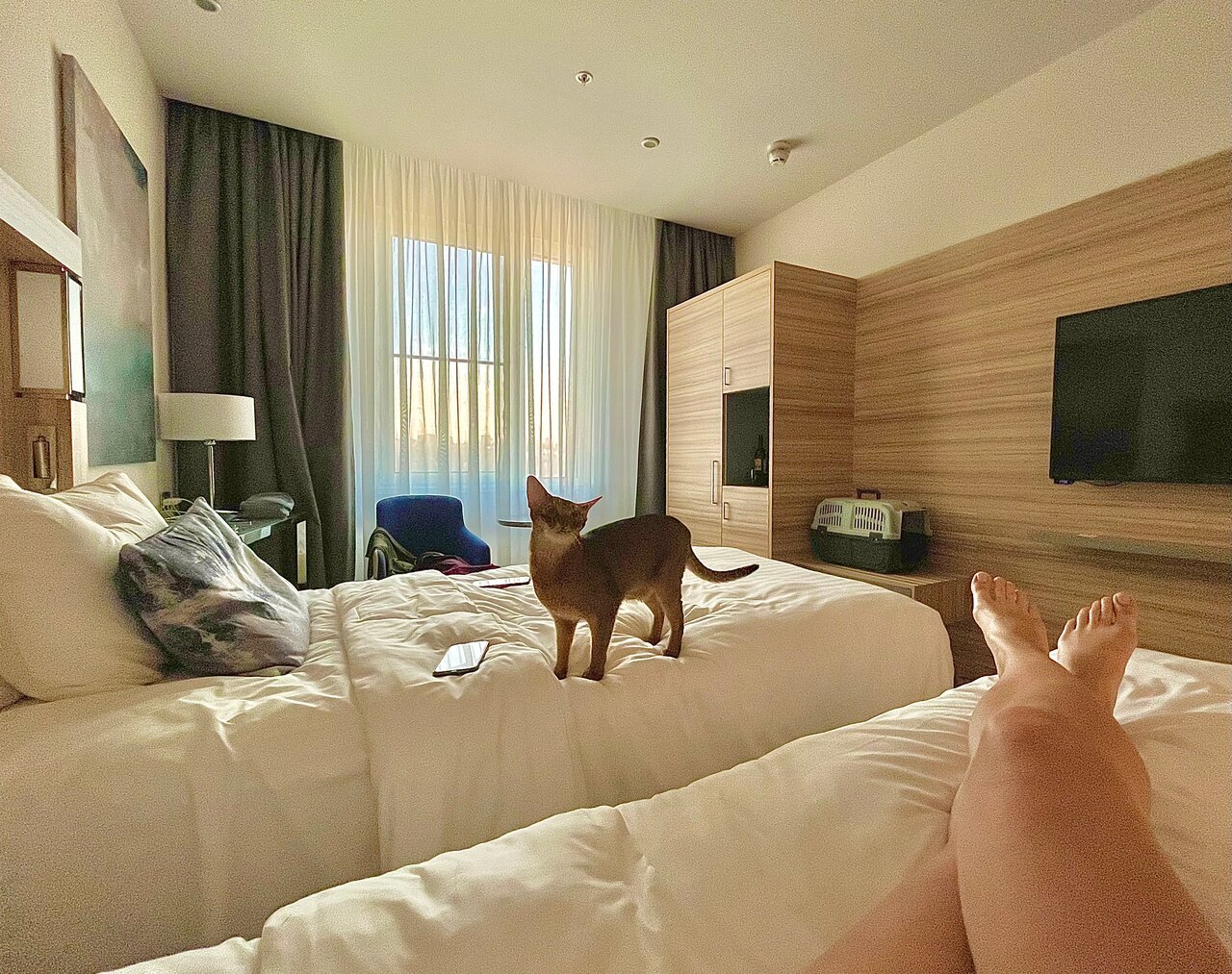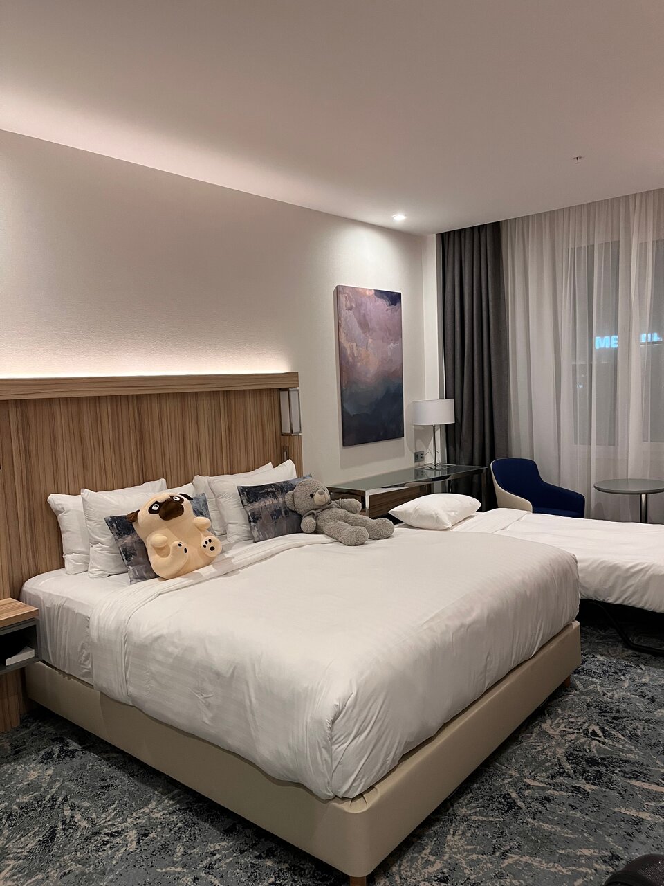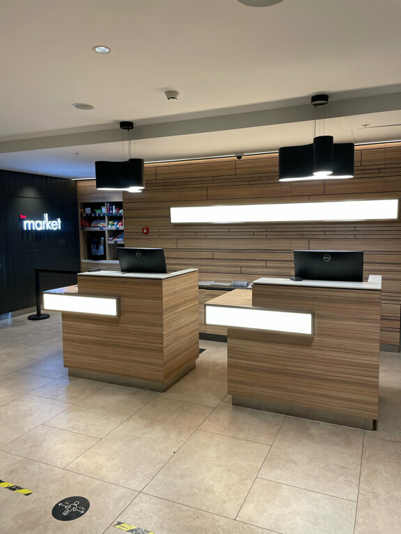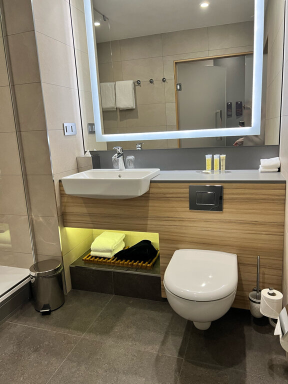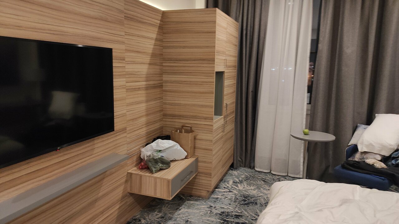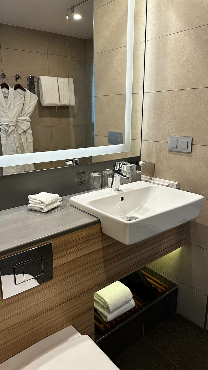 Отель — хорошее наследство Cortyard. В момент нашего пребывания коммунальщики прорыли траншею на въезде к отелю. Три раза крутились, пока не поняли, что ‘временный въезд’ через бордюры и буераки. Лобби для завтрака показался тесным, может мне просто угораздило прийти когда было максимум людей. Мы останавливались с небольшой собакой — 9кг. По условиям размещения с животными — взнос 3000р за весь срок проживания. -Ну ок, нормально! Но потом мне на почту пришел фискальный чек. Там было написано: ’- Доп услуги: Курение в номере/Размещение с животными — 3000руб. Мелочь конечно, но неприятно, что курение в номере, которое вообще запрещено законом приравнивается к размещению с друзьями человека