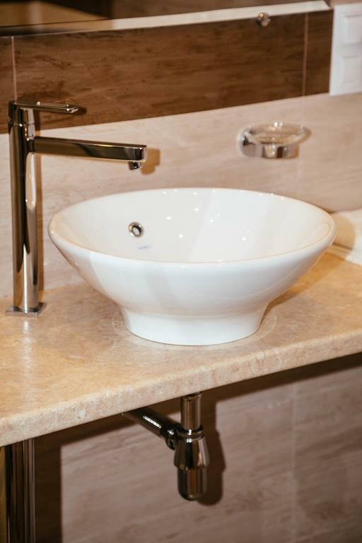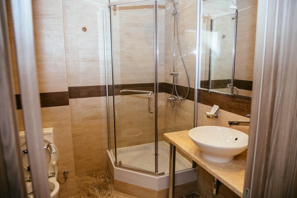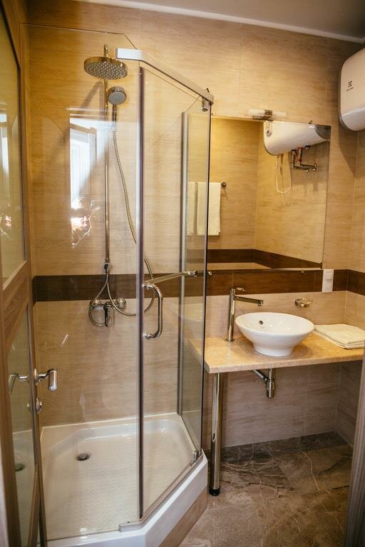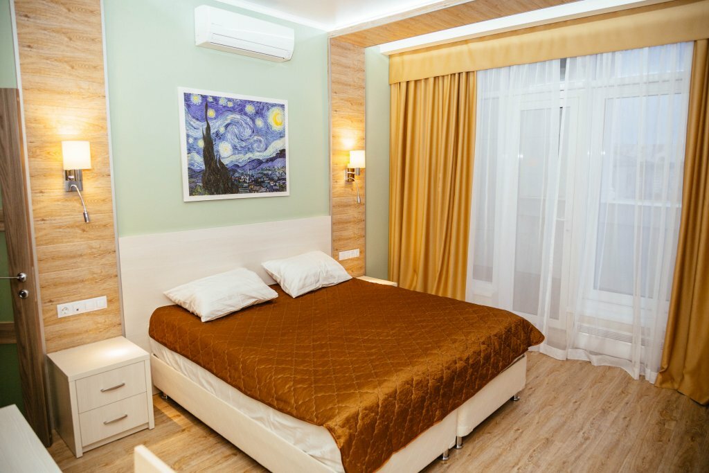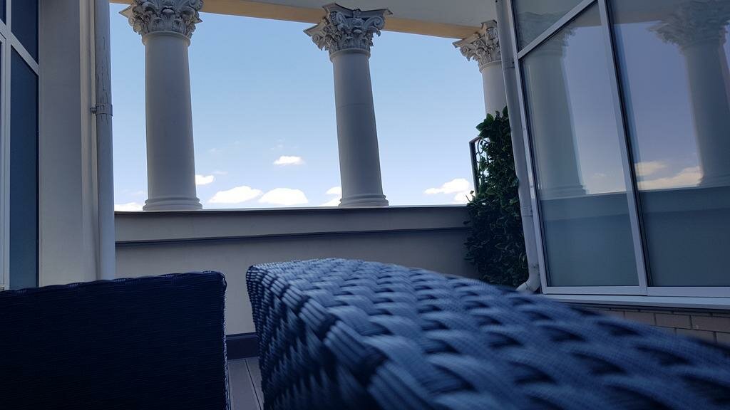 На сайте указано, что это апарт-отель, но номера в гостинице обычные, не апартаменты. Номера либо с балконом, либо с терассой — звучит привлекательно, но высокий парапет практически не позволяет ничего увидеть. Что не понравилось — имеется подземная парковка, но ворота очень узкие, на большие машины (джип) не рассчитаны, поэтому пришлось бросать машину на улице, причем днем место найти было проблематично. Еще к минусам можно отнести отсутствие централизованного водоснабжения — напор воды из водонагревателя очень слабый. В остальном все понравилось — уютный современный номер, просторный, чистый. Расположение в центре очень удобное