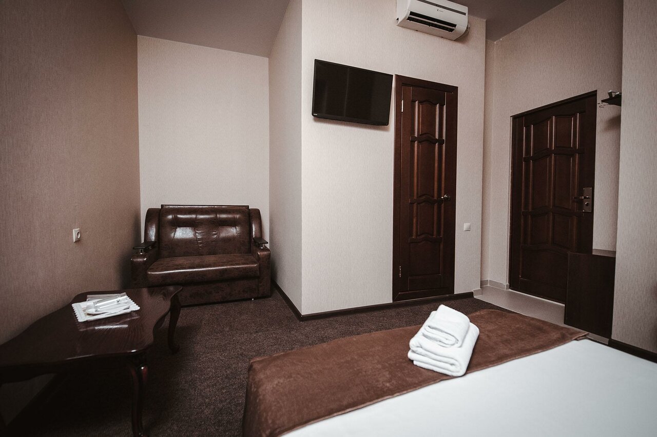 Номер однокомнатный, 2-х спальная кровать, прикроватные тумбочки,туалетный столик с зеркалом,пуф, журнальный стол,санузел с душевым отделением, туалетные принадлежности(гель, шампунь, мыло), полотенца, ЖК телевизор, сплит-система при входе вешалка.