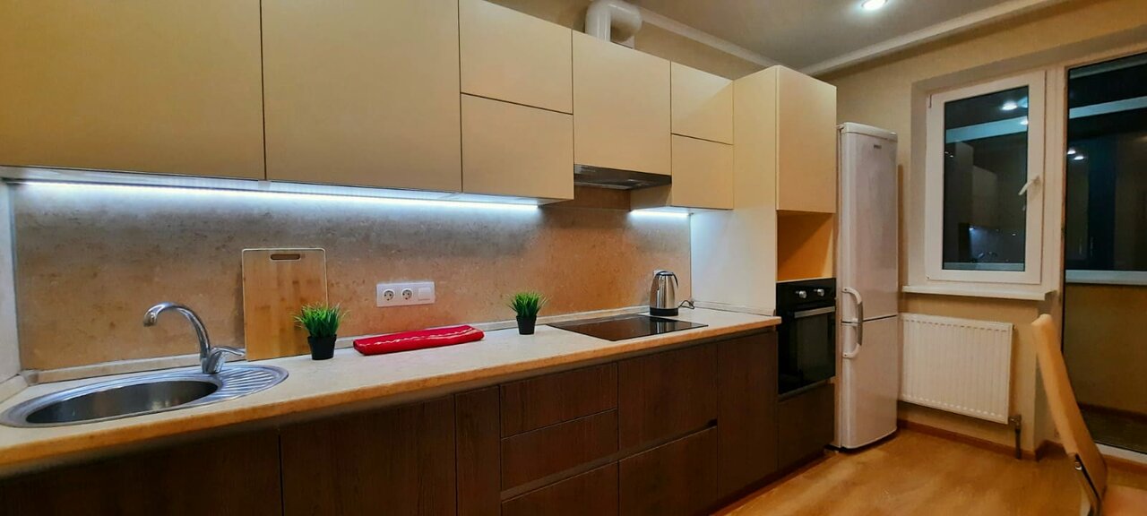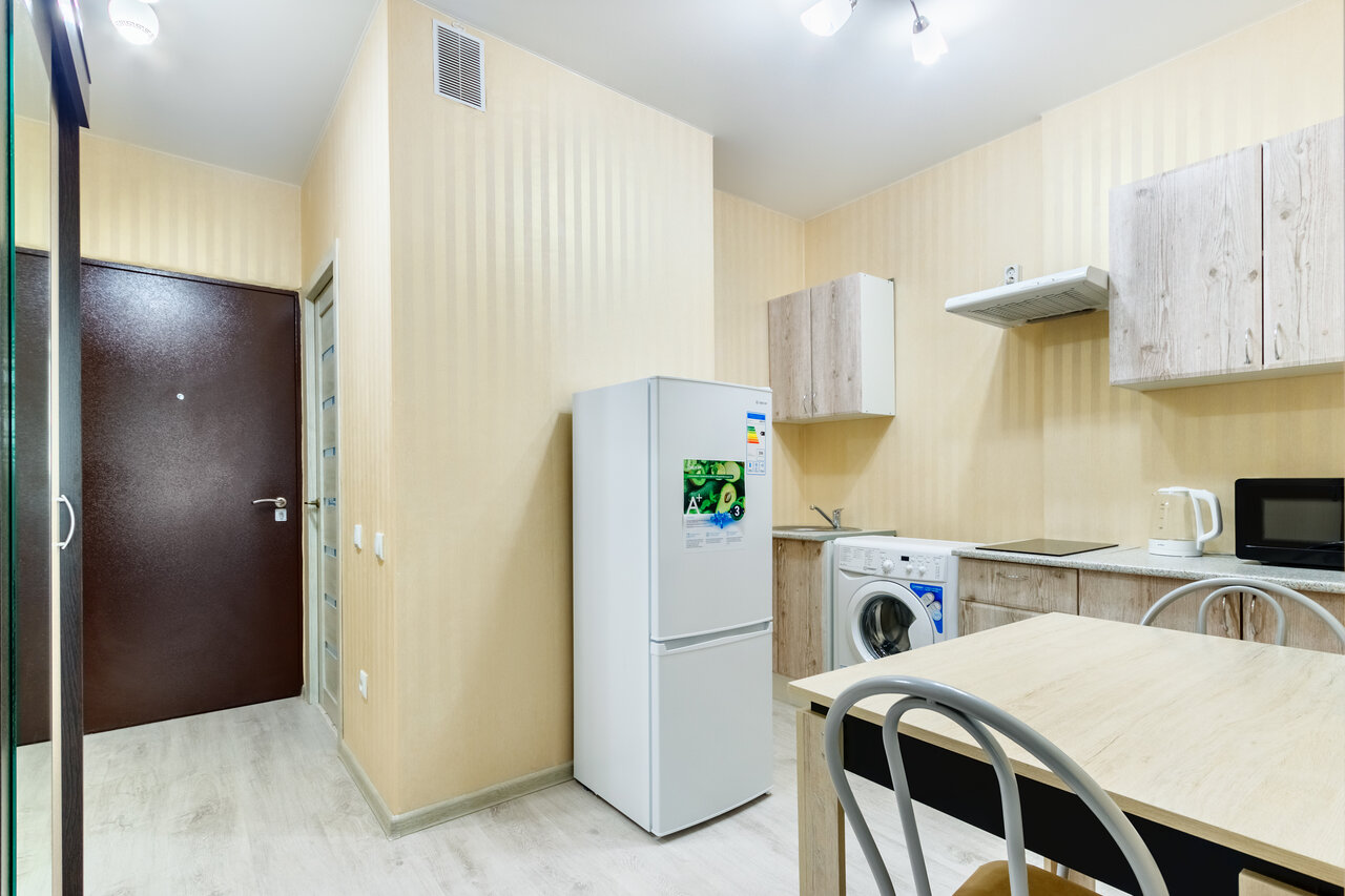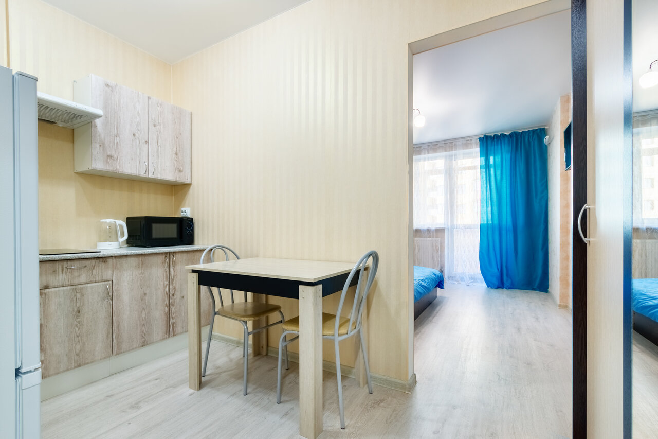 Отличная квартира на двоих. Все есть, посуда, полотенца, кухонные принадлежности, банные принадлежности. Просто супер!! На территории жк магазины, рядом много супермаркетов, транспортная развязка отличная. Рекомендую!!