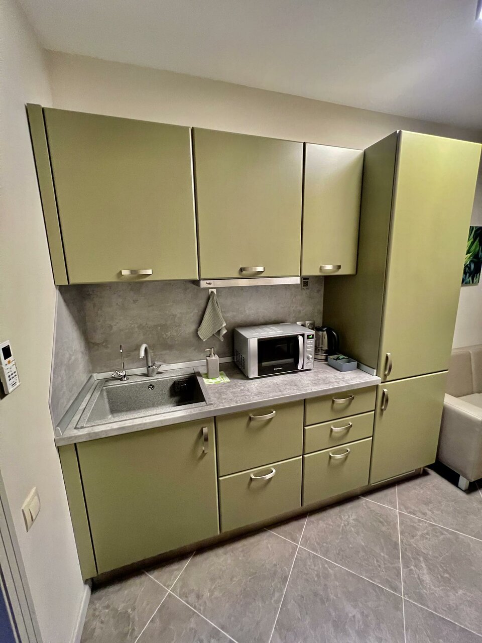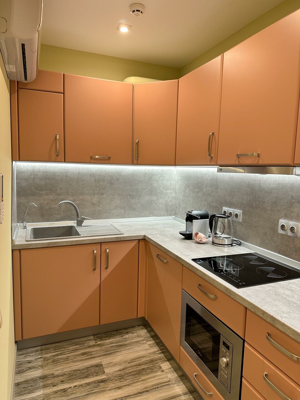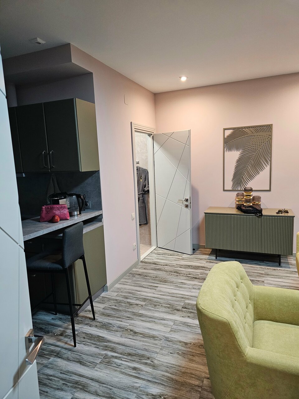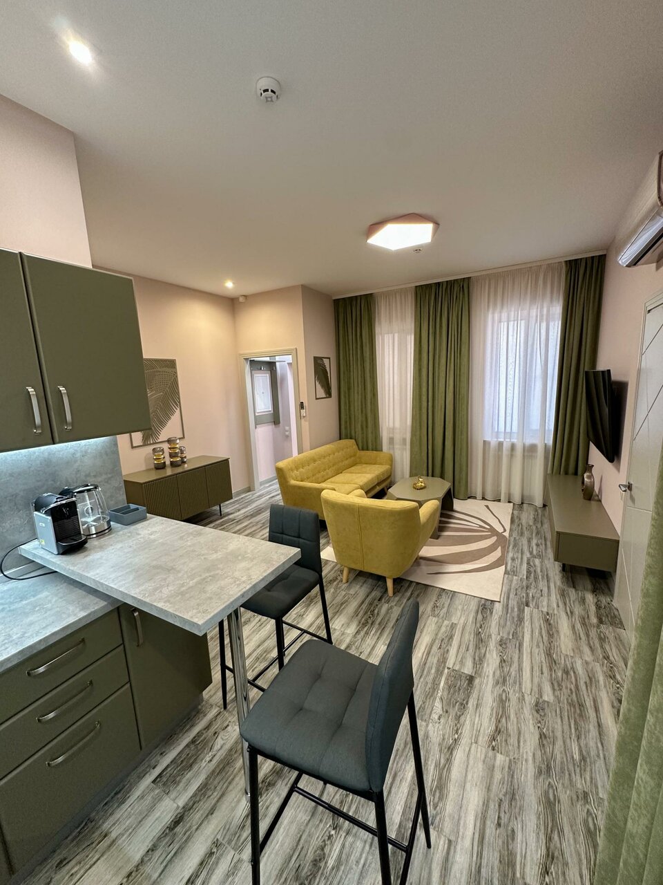 Чистый, свежий, дизайнерски оформленный аппарт-отель. Номер просторный, все продумано до мелочей, все расходники (капсулы кофе, сливки, чай, сахар, средство для посуды и тряпочки, шампунь и тп) пополняются, ничего докупать не придется. Уборка отличная, все сияет. Телек с ютубом, два сплита с мягким потоком. Самый центр города и полная тишина в номере. Все прекрасно. Из минусов, кому это важно: твердые подушки (я со своей) и нет платяного шкафа, но по запросу поставили планку с плечиками. Наверняка еще вернусь. Рекомендую.