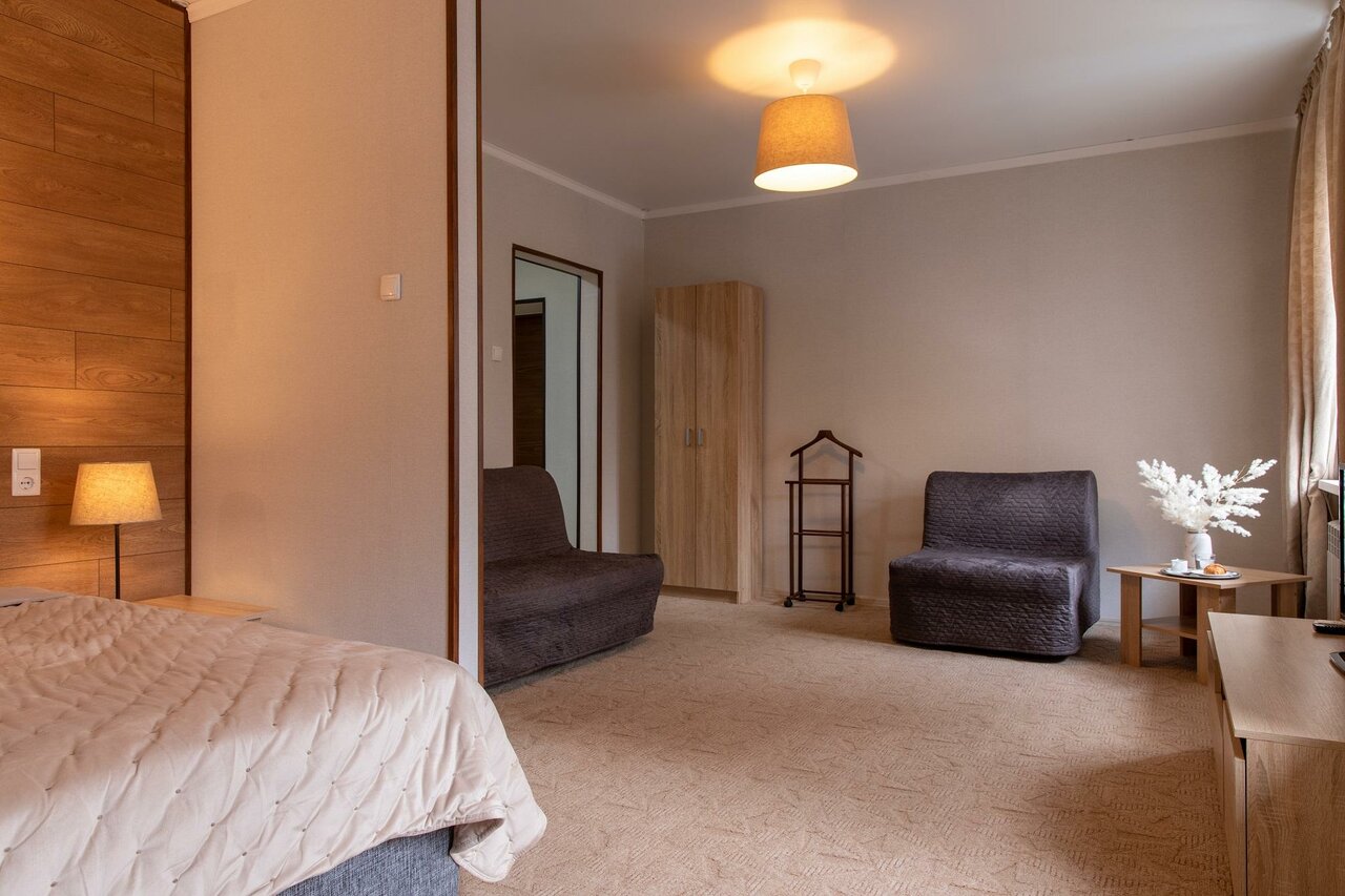 Номер с гостиной зоной. Возможно пятиместное размещение. Дополнительные места - раскладной диван и кресло-кровать.Площадь: 35 кв.м.