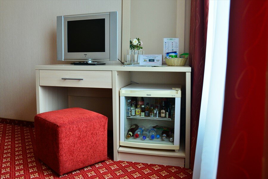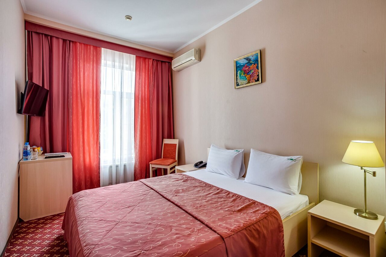 Душ и сан/узел в номере, одна односпальная кровать, мини-холодильник, чайник, микроволновая печь, жк-тв, полотенце, стол, стул, вешалки, зеркало.Площадь номера 12 м².Номер для 1 гостя.
