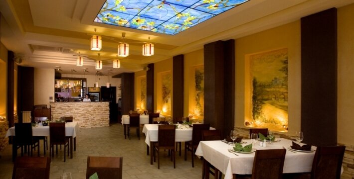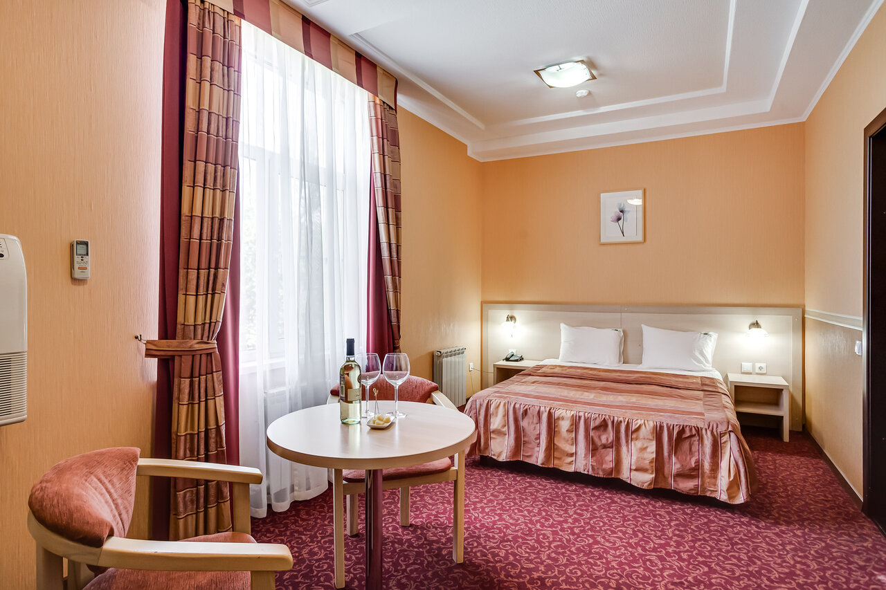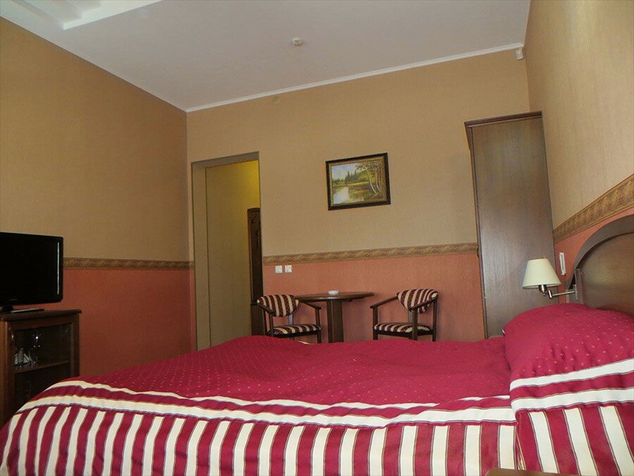 В номерах: кондиционер, Wi-Fi, мини-бар, телевизор, фен. Для гостей — сауна, купальня, настольный теннис, терраса. До центра — менее 3 км, рядом парк. Доступны услуги носильщика, прачечной, ускоренная регистрация. Питание: завтрак (по меню), полупансион или полный пансион.