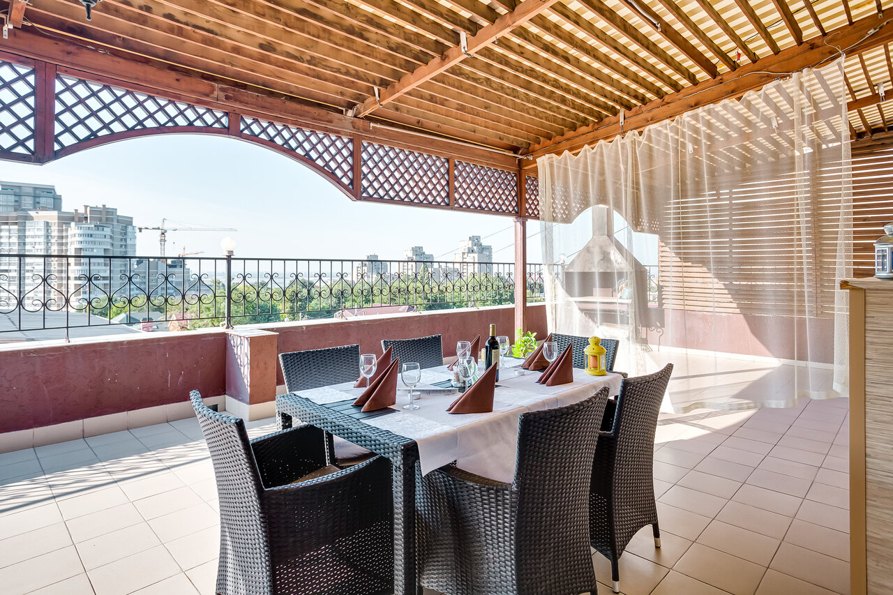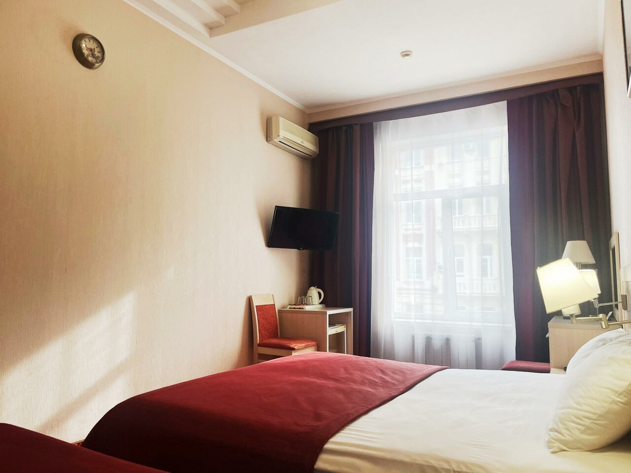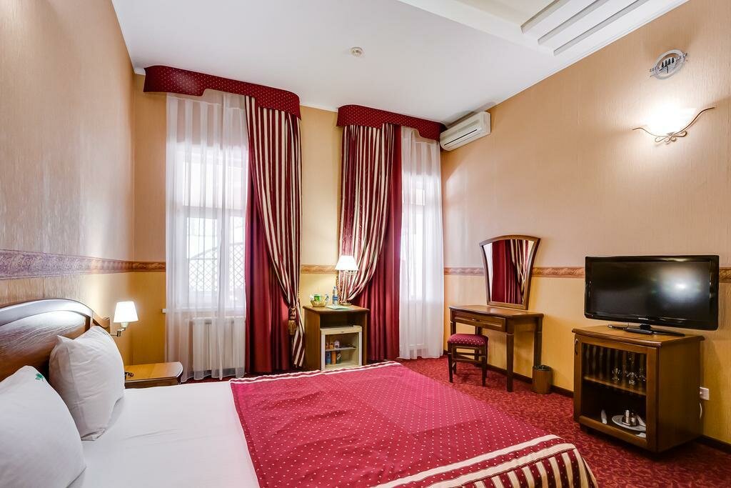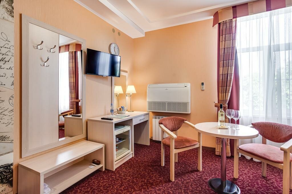 Хорошая чистая гостиница, хоть и не новый ремонт. Удобное расположение — рядом парк с колесом обозрения и здание театра Драмы. Есть парковка перед входом в гостиницу. У нас был номер с отдельным выходом на террасу.