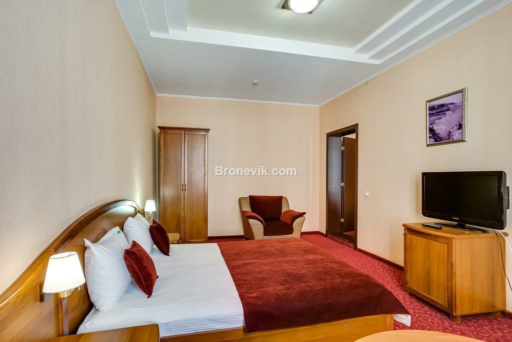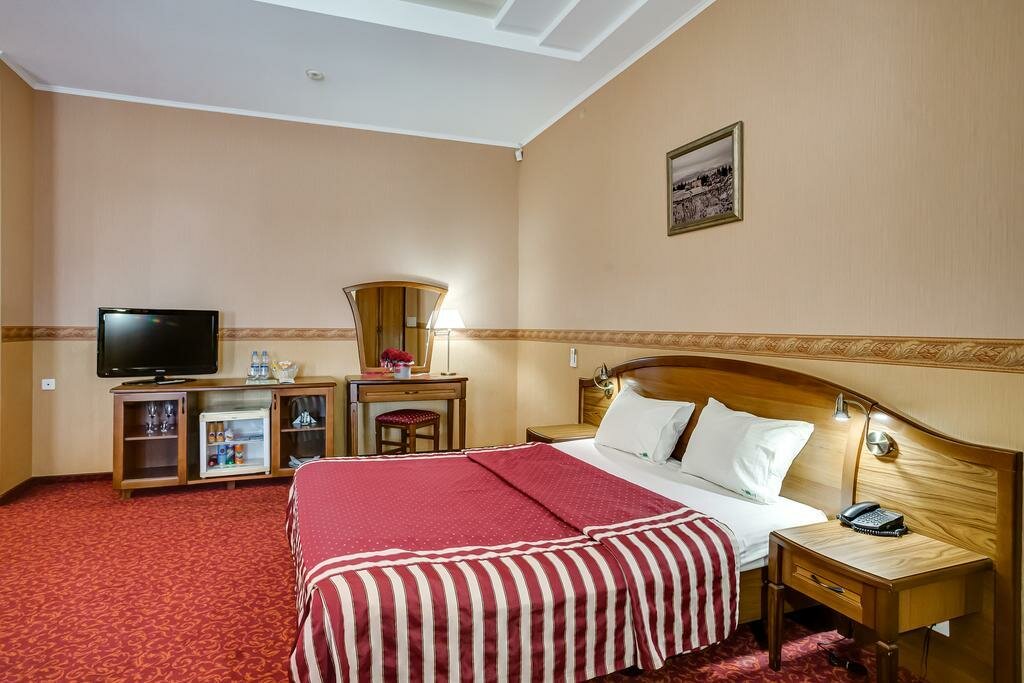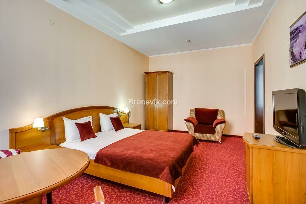 Душ и сан/узел в номере, одна двуспальная кровать, более просторная планировка, мини-холодильник, чайник, микроволновая печь, жк-тв, полотенца, стол, стулья, зеркало. Площадь номера 15 м².Номер для 2 гостей.