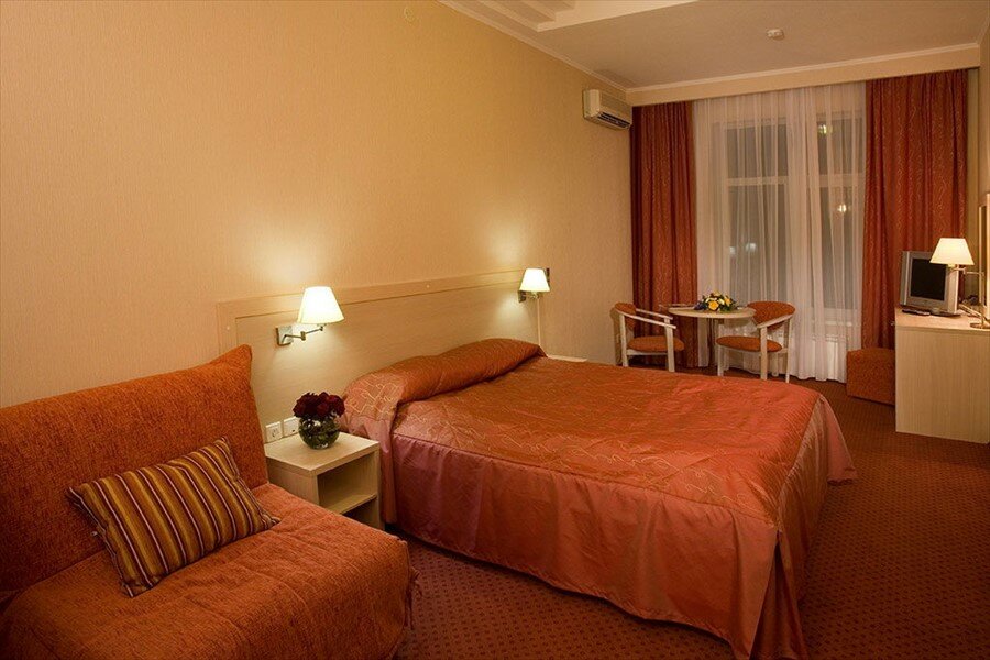 Тщательно подобранный интерьер номера создает атмосферу уюта для плодотворной работы или беспечного отдыха. В числе удобств —2 телевизора с плоским экраном, кондиционер, холодильник, сейф, фен, халаты, тапочки, зубная щетка, паста, гель и шампунь.