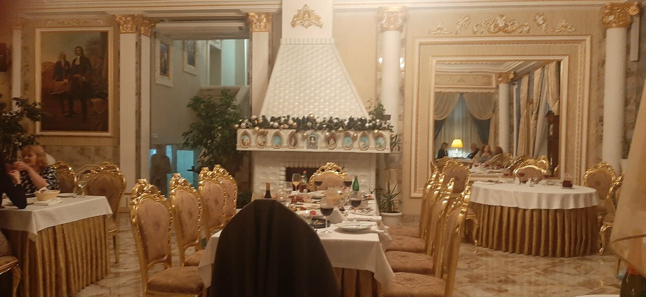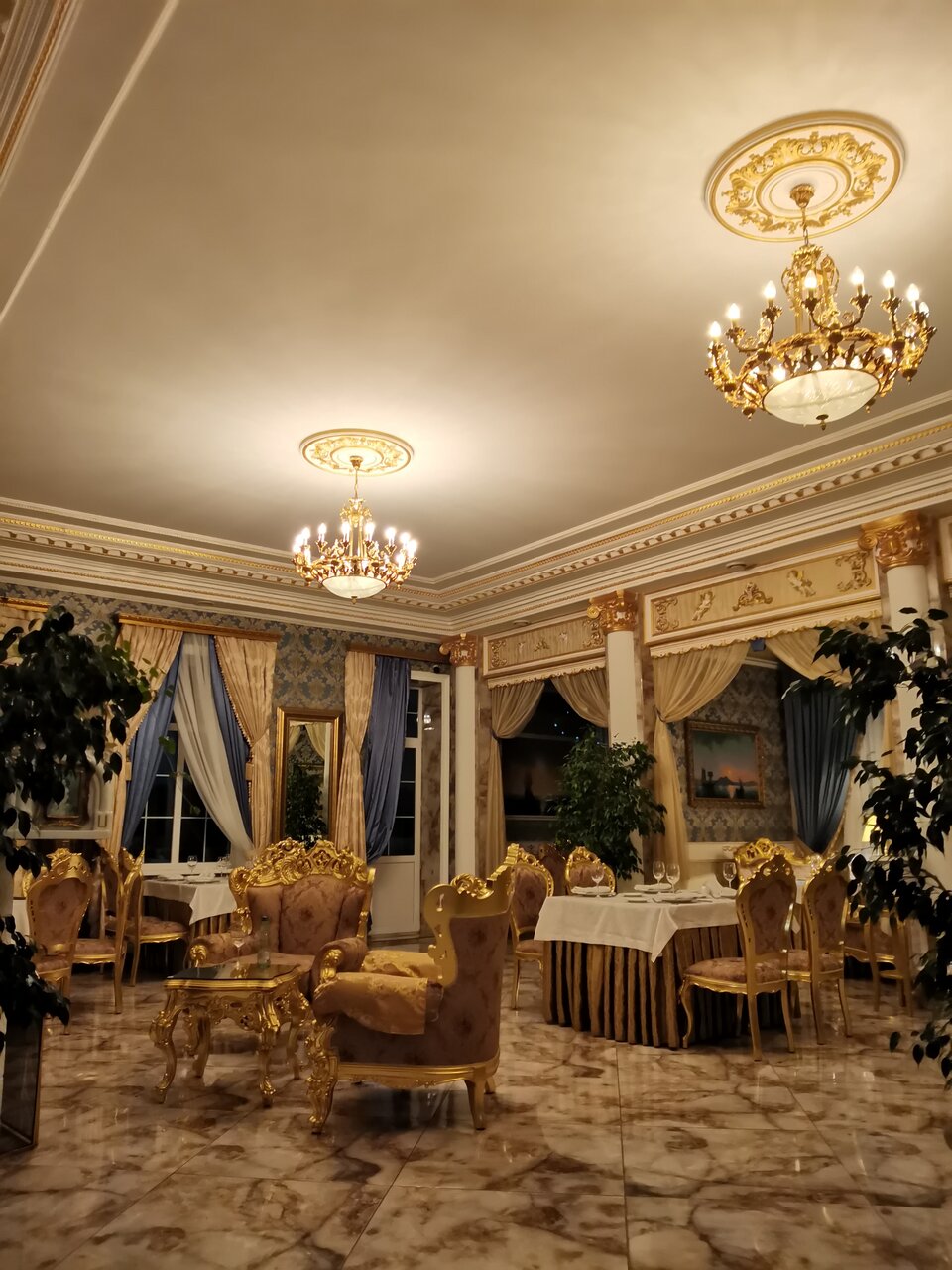 Единый стиль всех заведений. По мне — так много золота. Но это антураж и он делает это место запоминающимся. Кухня не плохая. Персонал отзывчивый. Много вариантов для торжеств — несколько залов.