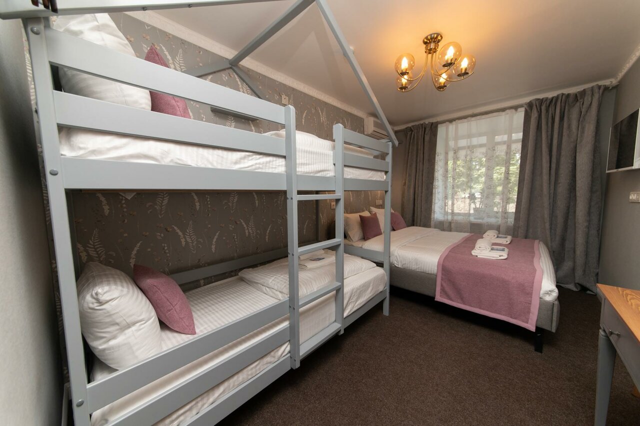 - Удобно для путешественников с детьми (есть двухъярусные кровати).