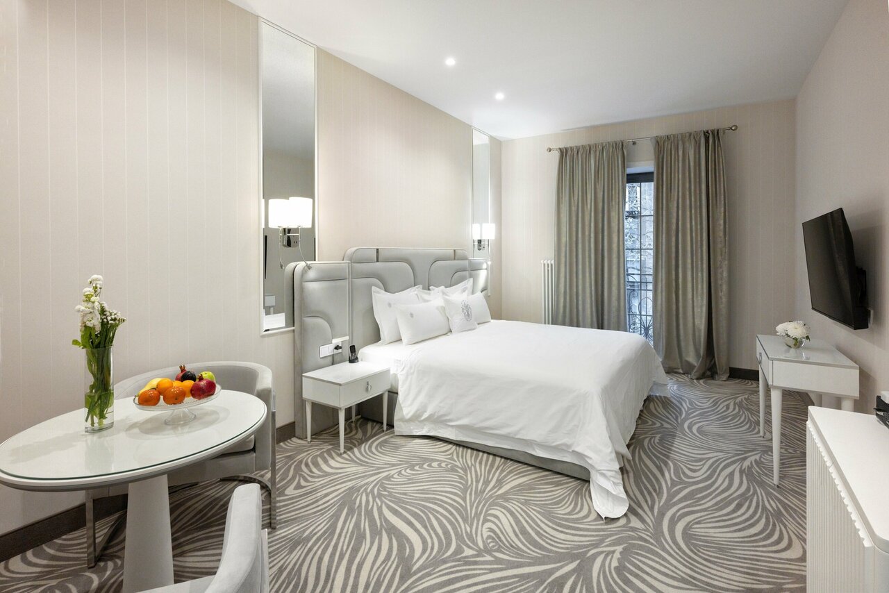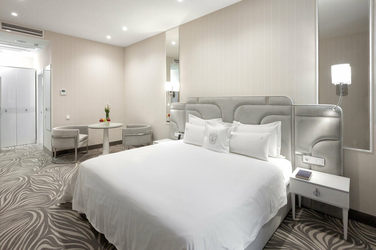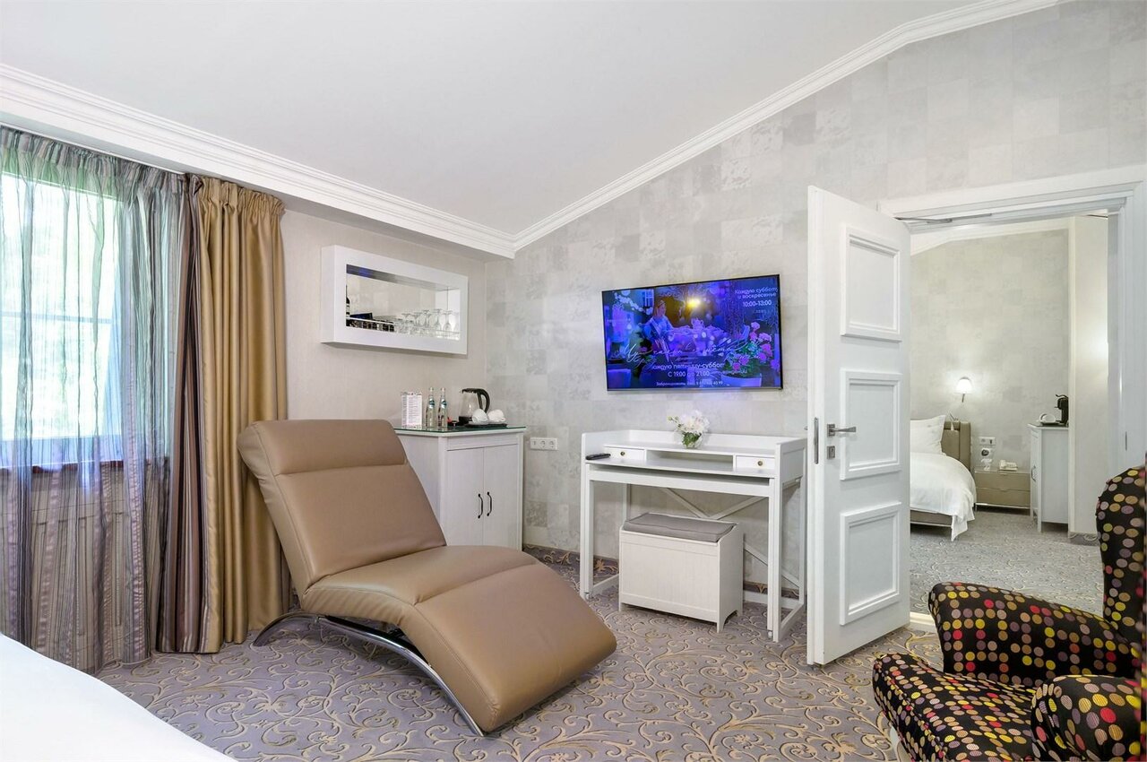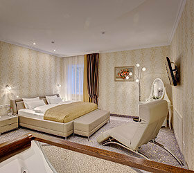 Идеальное решение для тех, кто хочет расслабиться и при этом всегда оставаться в рабочем режиме. Номер оснащен большой кроватью и располагает уютной зоной отдыха.