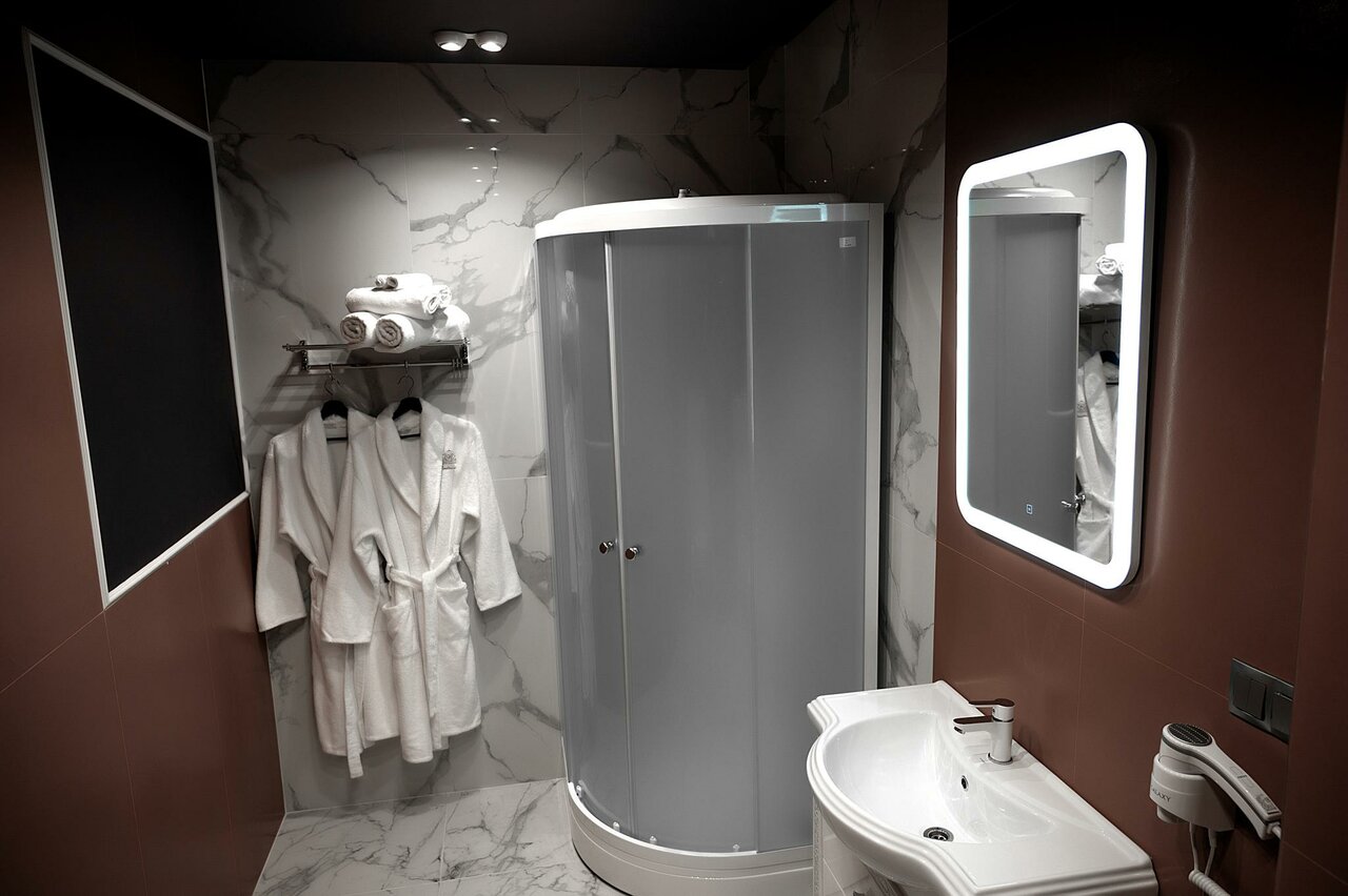 Отель полностью новый только что открылся. Оснащение номеров за эти деньги просто офигенное. Матрасы на кровати очень удобные, спать одно удовольствие. Полотенца, халаты, тапочуи, мыльные и прочие принадлежности, в том чисде даже бритва одноразовая. На территории есть сауна и бассейн. Утром отлично позавтракали в кафе. Завтрак тоже был на уровне.
