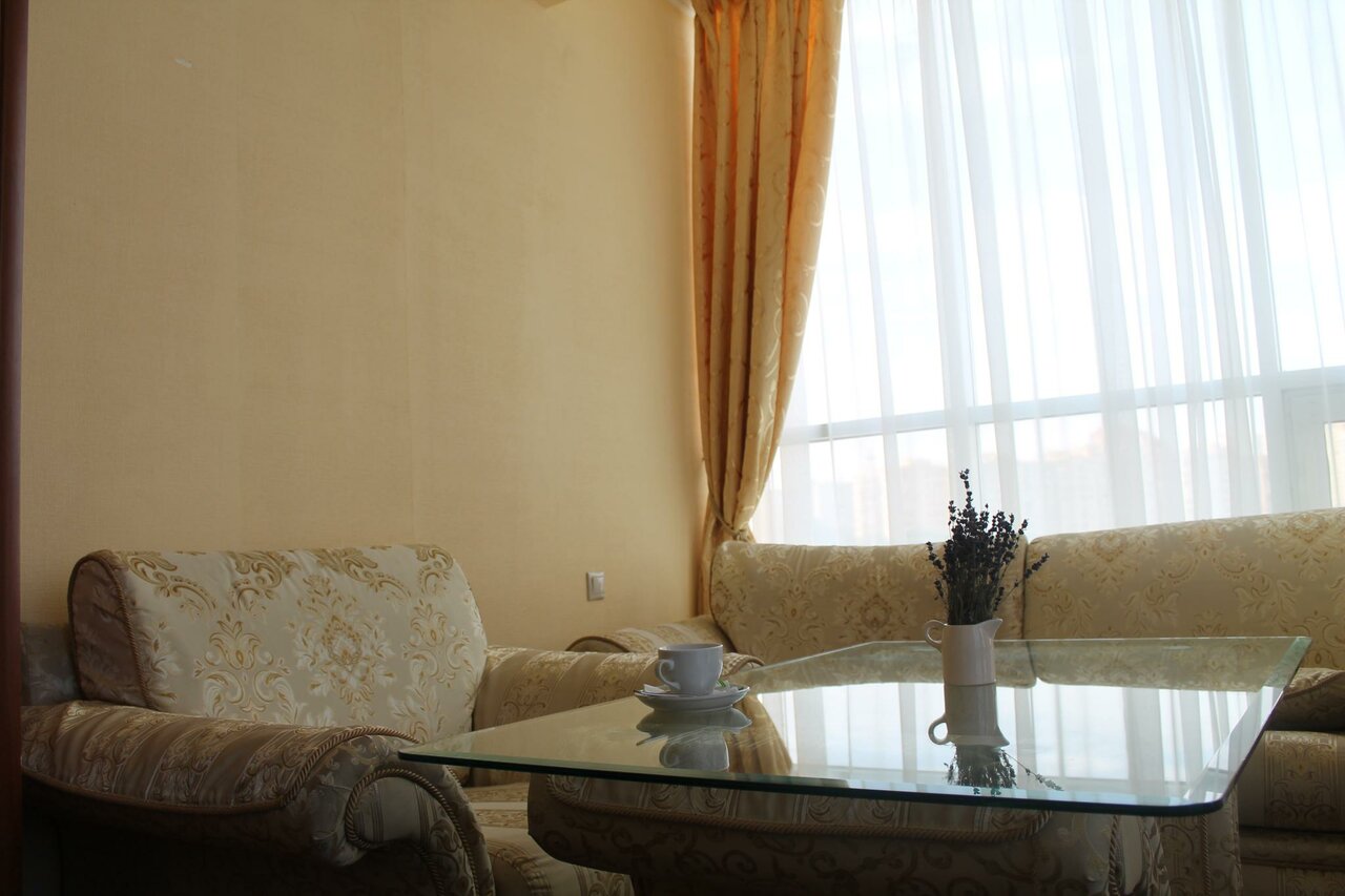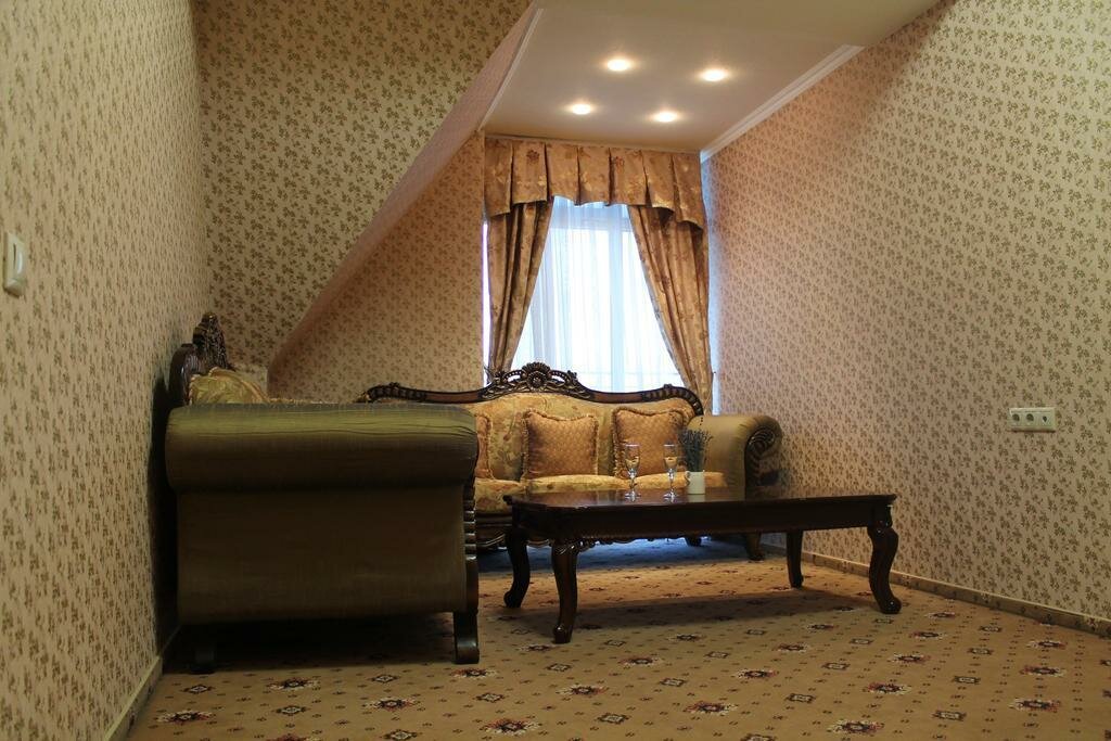 Шикарный номер в отеле 'ВИА' в Феодосии, 82 кв.м. Все для вашего комфорта: двуспальная кровать, кресла, диван, TV, кондиционер, холодильник, чайник с посудой, мини-сейф, душ, полотенца, косметический набор, фен, халаты и тапочки. Бронируйте!