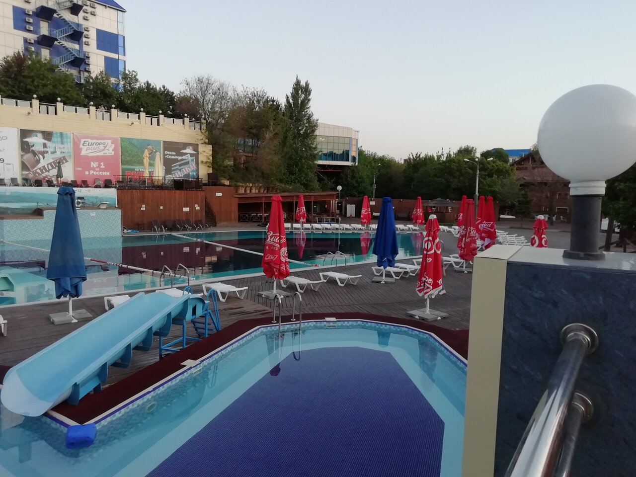 Хорошая гостиница, номер чистый, кровать широкая. Кондиционер работает. Есть бассейны и пара водяных горок можно рекомендовать для отдыха с детьми. Включенный в стоимость номера завтрак на 4-4,5. Цены в ресторане демократичные(по меркам Москвы), блюд дороже 100рэ а меню нет. Мне обед из 3х блюд меньше 300рэ вышел. По локации от центра Ростова не близко, но такси по городу 200-250рэ стоит.