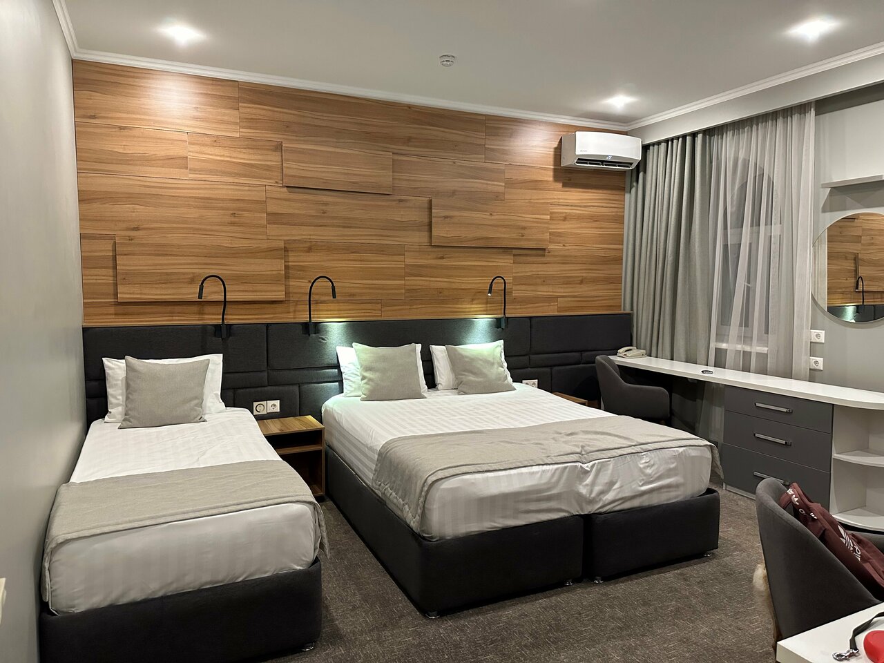 Просто замечательное место! останавливались с 8 на 9 сентября. 1. Наилюбезнейший персонал, прям со входа чувствуешь тепло и расположенность 2. наличие парковки под видеонаблюдением — за это отдельное спасибо! 3. Номер чистый, красивый, уютный! 4. кровать двухспальняя с единым матрасом 5. хорошо работающий кондиционер! 6. Можно с питомцем 7. Вкусный завтрак за небольшую плату в 250: и глазунья с сосисками хорошая, блинчики с мясом и блинчики с творогом просто объедение! 8. хорошая звукоизоляция — так хорошо выспаться давно не получалось, даже дома! 9. есть полотенчики, туалетные принадлежности, фен!, на каждом этаже гладильная зона, обязательно вернемся в этот отель снова!