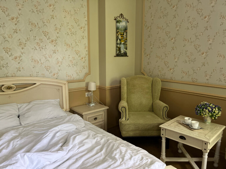 В номерах чисто, сервис отличный. Дизайн интерьера из 1995 года, на любителя. Закрытый паркинг на 6 машин с видеонаблюдением.