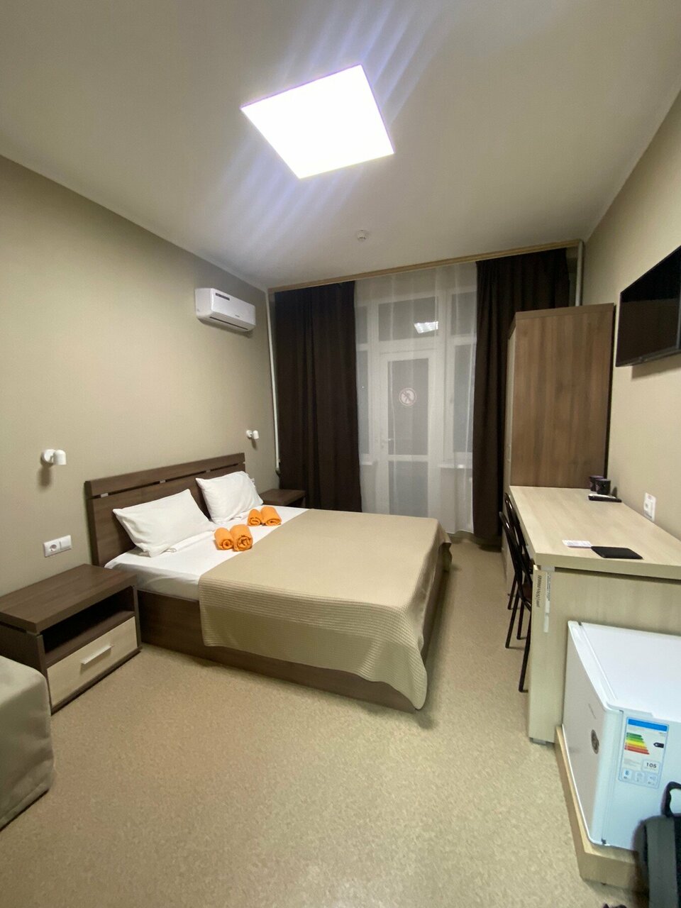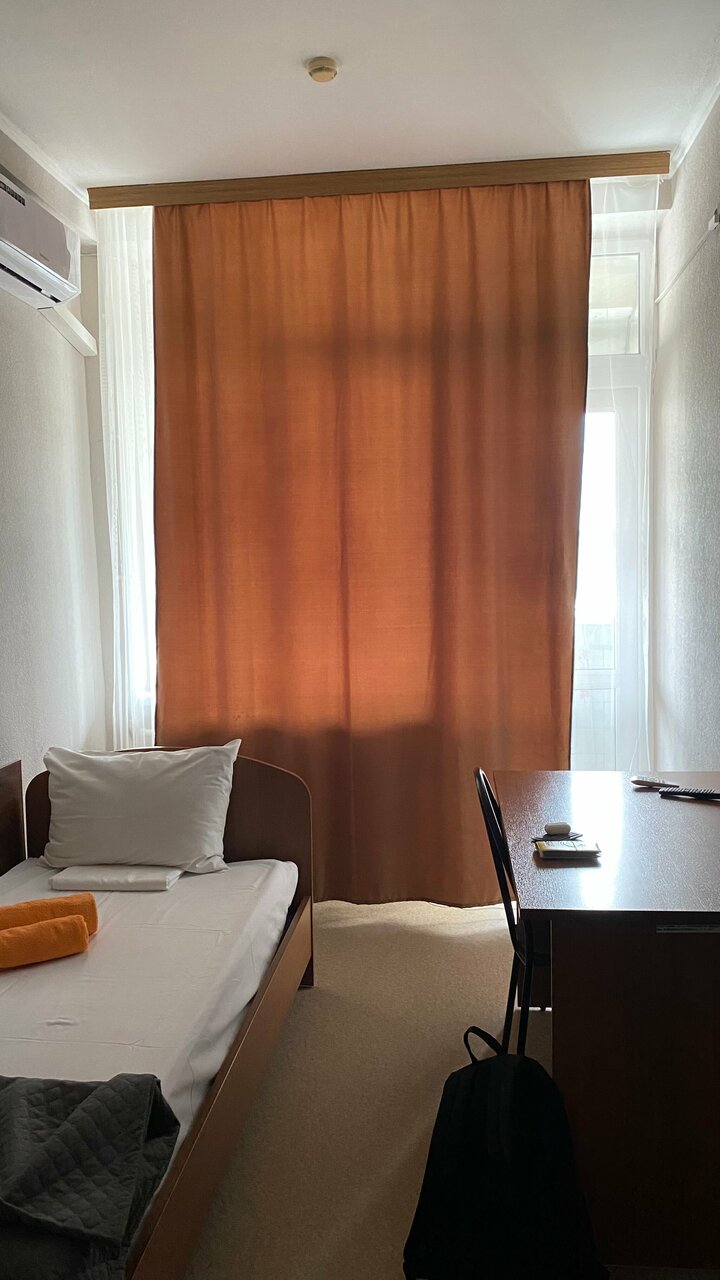 Номер одноместный. Сам по себе чистый, опрятный и без запахов номер, есть телевизор, кондиционер холодильник и на всякий случай раскладушка. Душ и туалет в холле который совмещён с другим номером. Дверь на балкон открывается только на проветривание. Из минусов штора одна на все окно, днем будет сложно поспать. Еще найдено было не понятное.