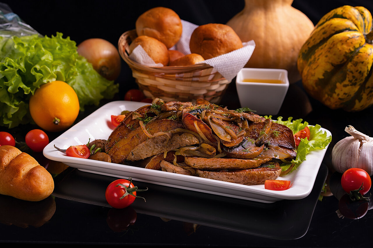 Жаренный картофель с мясом и грибами - 420 гр. - Свинина или курица, Картофель, Грибы шампиньоны, Лук репчатый, Чеснок, Укроп, Специи