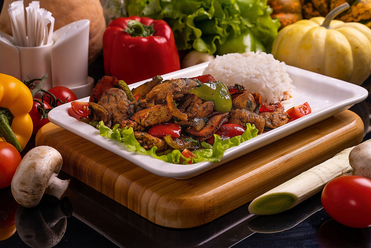 Wok (из свинины или курицы) - 450 гр. - Лапша яичная, Свинина или курица, Лук, Морковь, Болгарский перец, Молодые кабачки, Фирменный соус, Кунжут,Лук зеленый, Специи