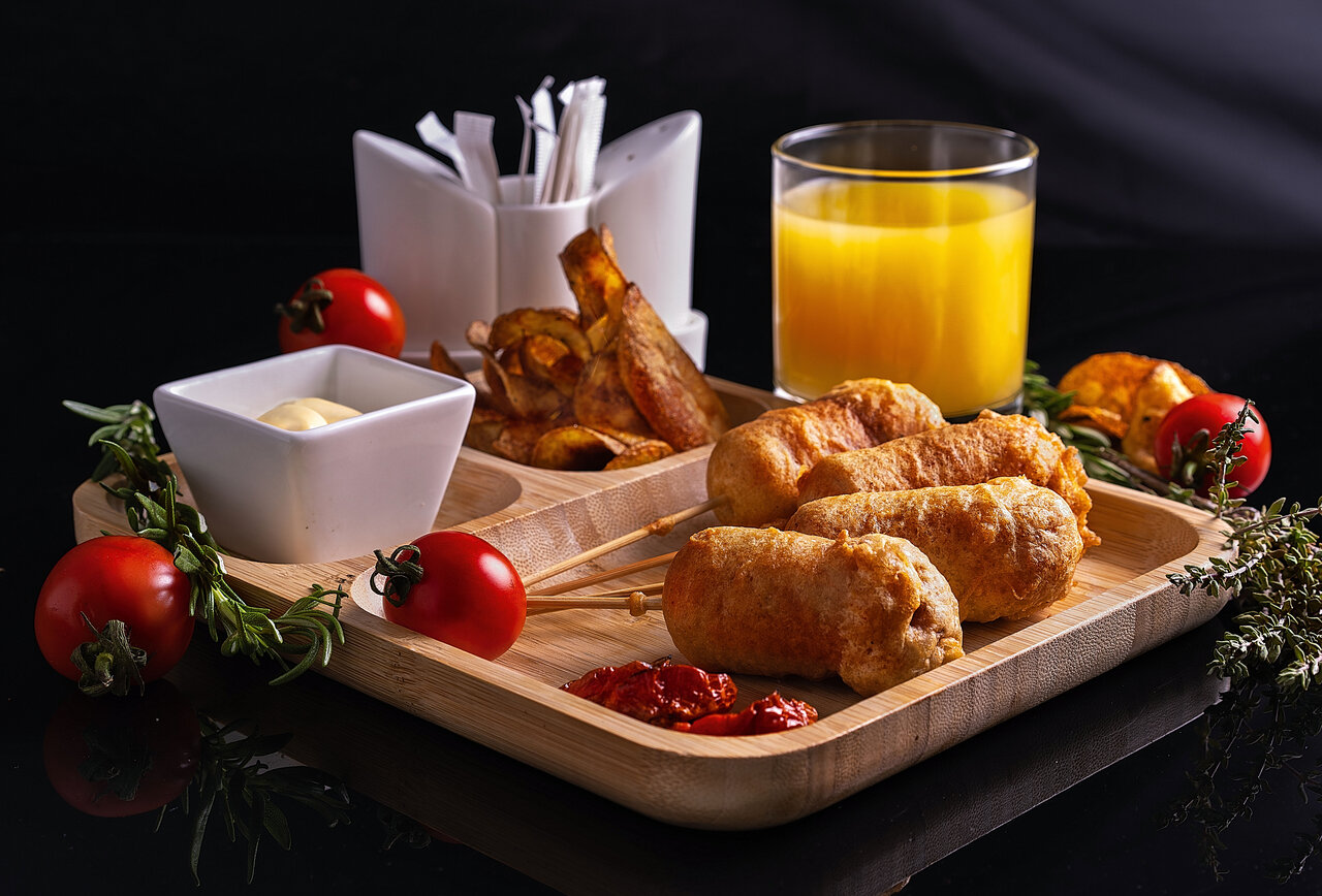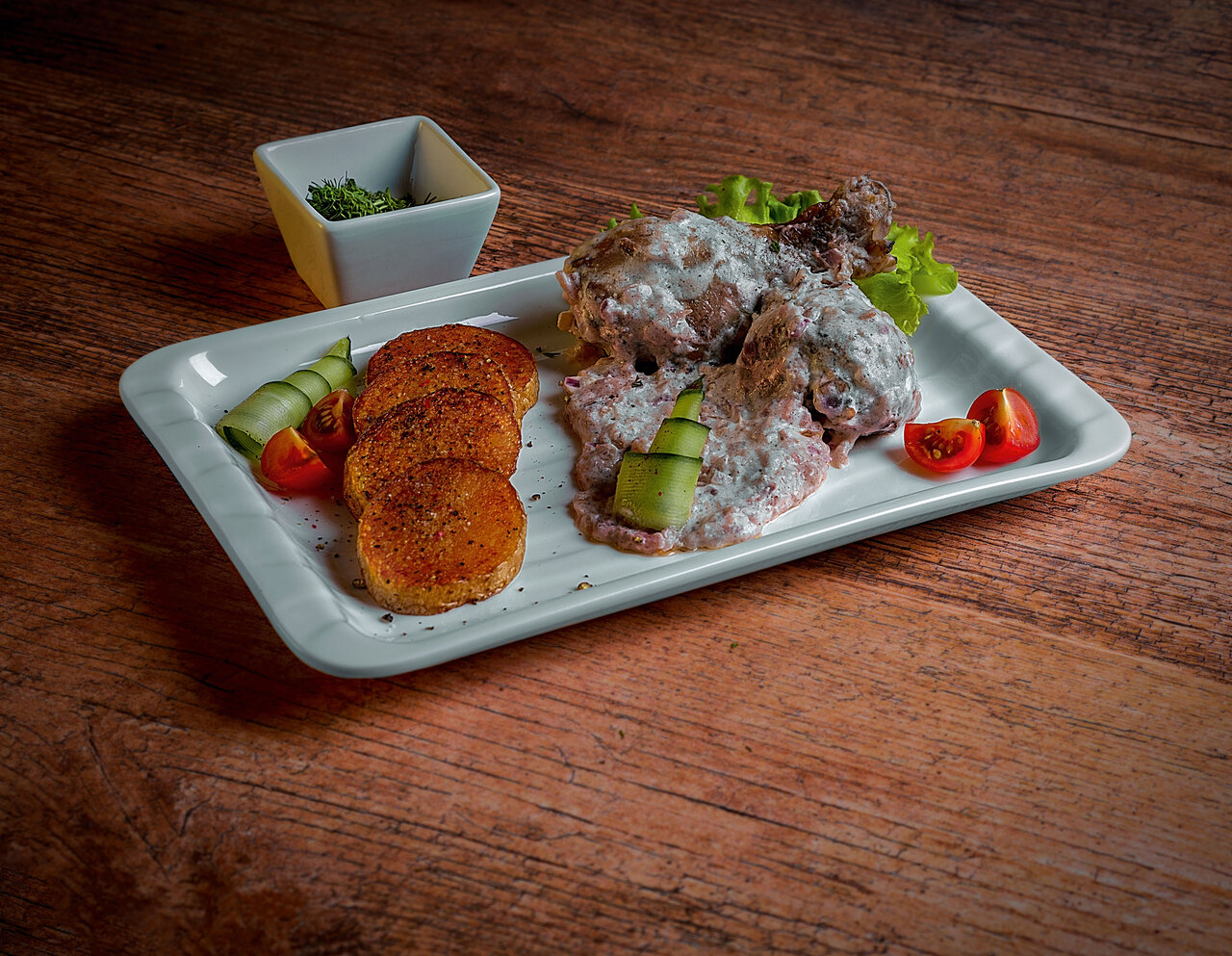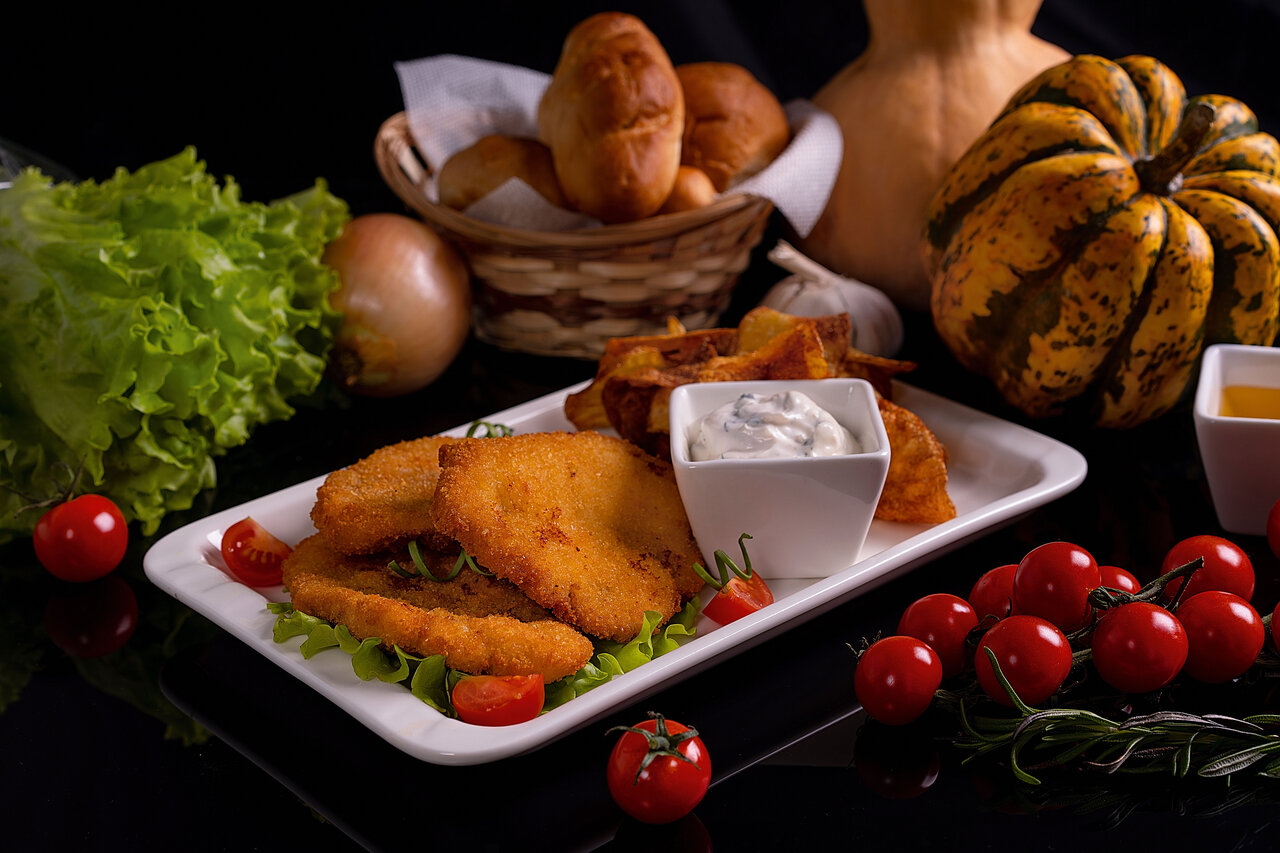 Куриная отбивная в панировке - 320 гр.- Филе куриное, Яйца, Картофель фри, Чесночный соус, Специи