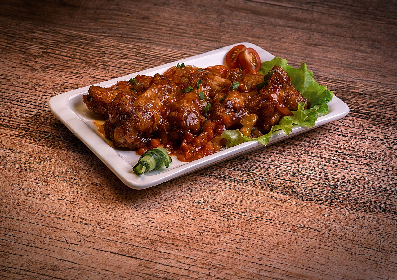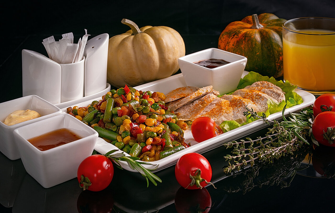 Куриные грудка отварная с овощами - 350 гр. - Куриная грудка, Лук, Перец болгарский, Морковь, Стручковая фасоль, Специи, Чесночный соус