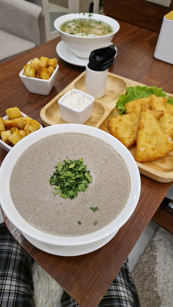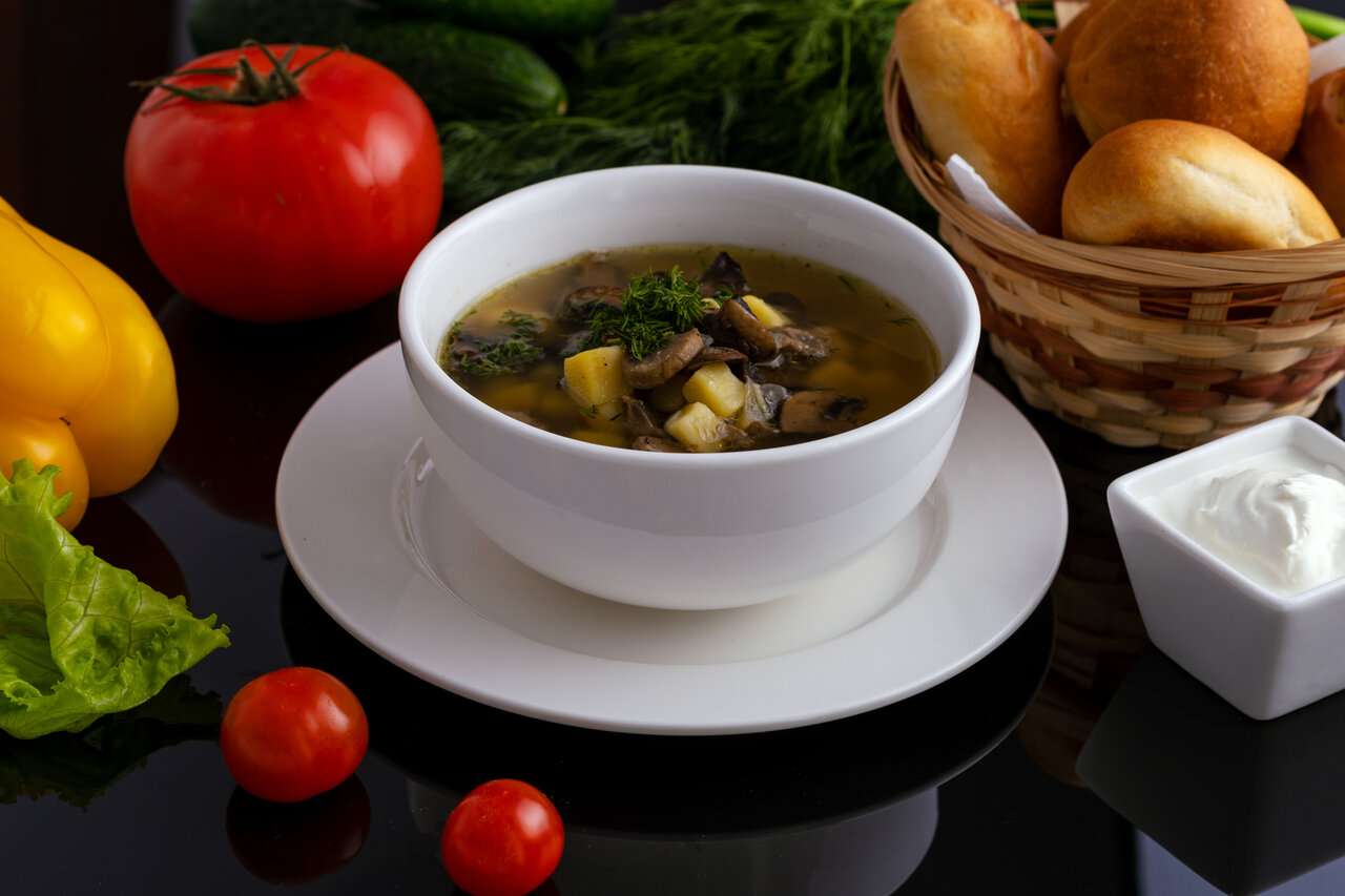 Грибной суп с курицей - 400 гр.-Куриное филе, Шампиньоны, Картофель, Лук, Зелень укропа