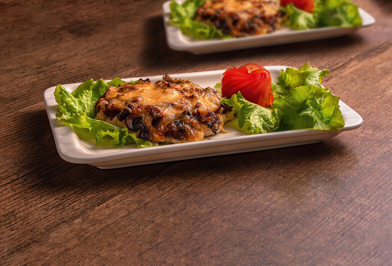 Мясо по французски - 350 гр. - Свинина, Лук репчатый, Картофель, Сыр твердый, Помидоры красные, Майонез, Специи