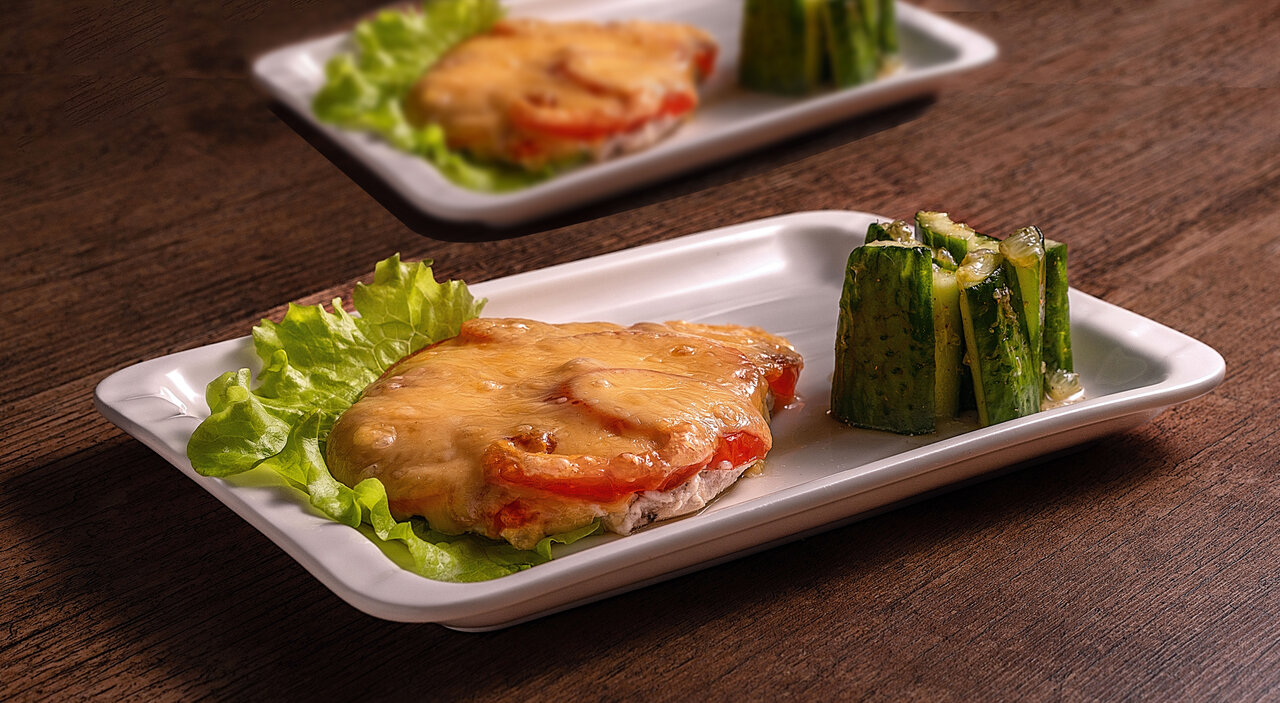 Куриная отбивная с грибами под сыром - 300 гр.- Куриная грудка, Грибы, Сыр, Лук, Майонез, Специи, Зелень