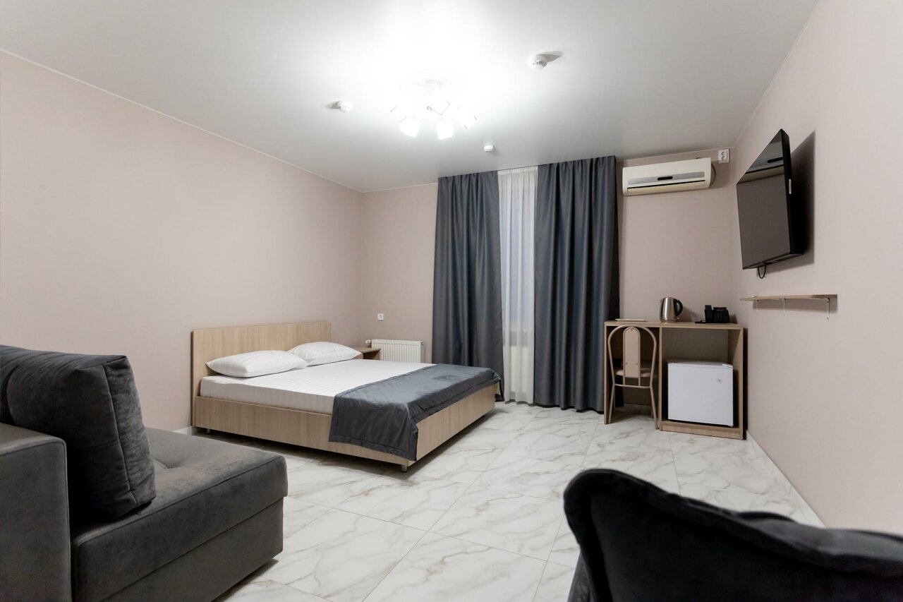 Номер с 1 двуспальной кроватью в Туле. Просторный однокомнатный номер, выдержан в классическом стиле. В номере: Телевизор, кондиционер, холодильник, гостиный уголок, DVD-плеер, диван, шкаф/гардероб, обеденный стол, душ, туалет, аксессуары